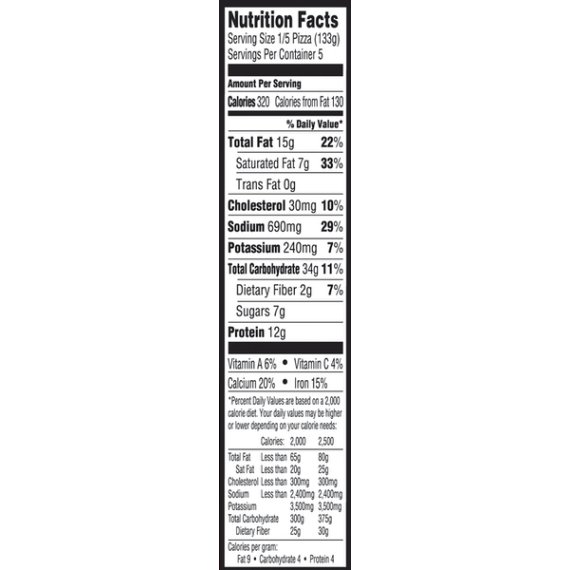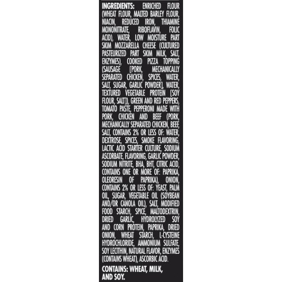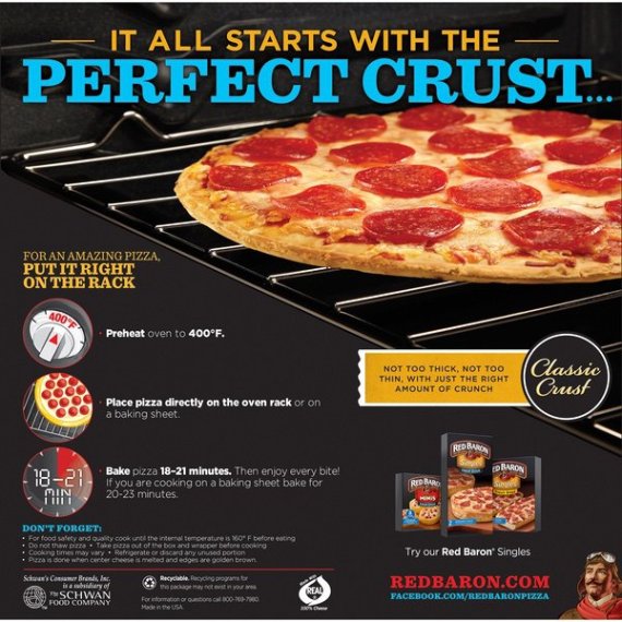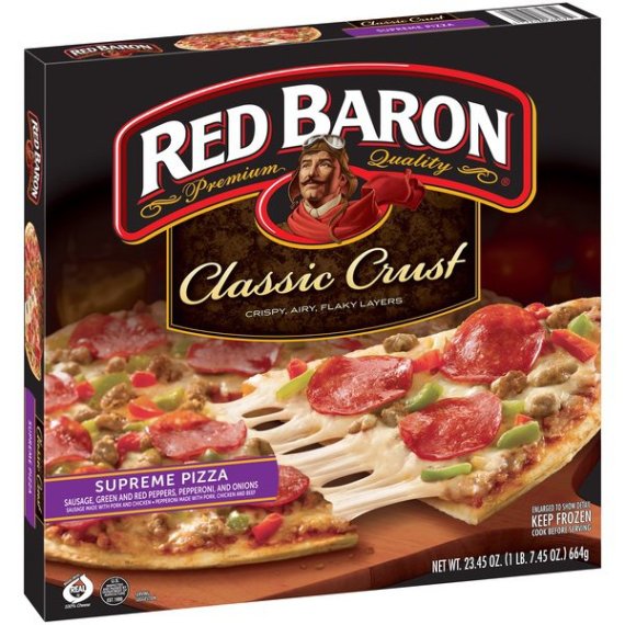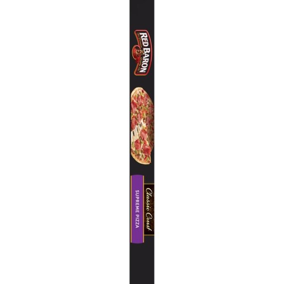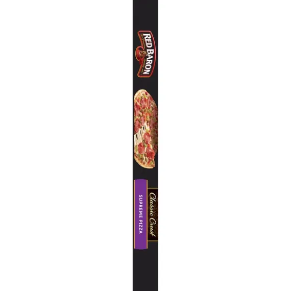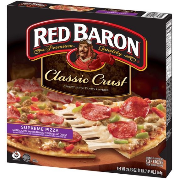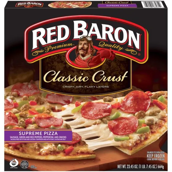 Details Ingredients Tomatoes (Water, Tomato Paste), Enriched Flour (Wheat Flour, Malted Barley Flour, Niacin, Reduced Iron, Thiamine Mononitrate, Riboflavin, Folic Acid), Low Moisture Part Skim Mozzarella Cheese (Cultured Pasteurized Part Skim Milk, Salt, Enzymes), Cooked Pizza Topping (Sausage [Pork, Mechanically Separated Chicken, Spices, Water, Salt, Sugar, Garlic Powder], Water, Textured Vegetable Protein [Soy Flour, Salt]), Bell Peppers, Pepperoni Made with Pork Chicken and Beef (Pork, Mechanically Separated Chicken, Beef, Salt, Contains 2% or Less of: Water, Dextrose, Spices, Smoke Flavoring, Lactic Acid Starter Culture, Sodium Ascorbate, Flavoring, Garlic Powder, Sodium Nitrite, BHA, BHT, Citric Acid, Contains one or More of: Paprika, Oleoresin of Paprika), Water, Onion, Contains 2% or Less of: Yeast, Palm Oil, Vegetable Oil (Soybean and/or Canola Oil), Sugar, Salt, Modified Food Starch, Spice, Maltodextrin, Dried Garlic, Sea Salt, Hydrolyzed Soy and Corn Protein, Paprika, Dried Onion, Wheat Starch, L-Cysteine Hydrochloride, Ammonium Sulfate, Natural Flavor, Soy Lecithin, Enzymes (Contains Wheat), Ascorbic Acid (Dough Conditioner). Show more Product features A supreme crust calls for supreme ingredients. Not too thin, not too thick - get ready for pizza supremacy. If you’re getting a supreme crust, why not load it up with supreme ingredients. Sausage, pepperoni, and green & red peppers raise this pizza to absolute pizza supremacy. Not too thick, not too thin, and loaded with awesomeness. There's a reason this crust is a classic – not too thick and not too thin, with just the right amount of crunch. Pizza, Classic Crust, Supreme Sausage, green and red peppers, pepperoni, and onions. Sausage made with pork and chicken. Pepperoni made with pork, chicken and beef. Premium quality. Crispy, airy, flaky layers. Made with real 100% cheese. Real. US inspected and passed by Department of Agriculture. It all starts with the perfect crust. Not too thick, not too thin, with just the right amount of crunch. Recyclable. Recycling programs for this package may not exist in your area. For information or questions call 1-800-769-7980. RedBaron.com. Facebook.com/redbaronpizza. Made in USA. Special Features Classic crust Net Quantity of Content 5.0 X 1/5 pizza (133g)