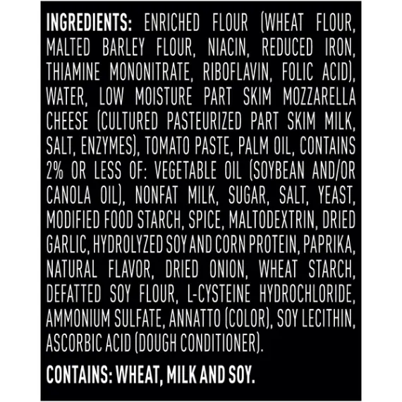 Details Ingredients Enriched Flour (Wheat Flour, Malted Barley Flour, Niacin, Reduced Iron, Thiamine Mononitrate, Riboflavin, Folic Acid), Water, Low Moisture Part Skim Mozzarella Cheese (Cultured Pasteurized Part Skim Milk, Salt, Enzymes), Tomato Paste, Palm Oil, Contains 2% or Less of: Vegetable Oil (Soybean and/or Canola Oil), Nonfat Milk, Sugar, Salt, Yeast, Modified Food Starch, Spice, Maltodextrin, Dried Garlic, Hydrolyzed Soy and Corn Protein, Paprika, Natural Flavor, Dried Onion, Wheat Starch, Defatted Soy Flour, L-Cysteine Hydrochloride, Ammonium Sulfate, Annatto (Color), Soy Lecithin, Ascorbic Acid (Dough Conditioner). Show more Product features Real, gooey cheese makes the perfect topping for RED BARON® Singles Cheese Deep Dish Pizza. When you’re craving a deep dish pizza, look no further than RED BARON® Singles Cheese Deep Dish Pizza. It’s loaded with real mozzarella cheese and robust sauce on a perfect deep dish crust. Savor mouth watering, perfectly portioned pizza made with real cheese, robust tomato sauce, and premium toppings on our classic crust Pizzas, Deep Dish, Cheese Premium quality. Real. Recyclable. Recycling programs for this package may not exist in your area. For further information or questions contact us at 800-769-7980. www.Redbaron.com. Made in USA. Special Features 2 pizzas Net Quantity of Content 2.0 X 1 Pizza (159g)