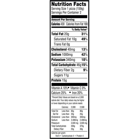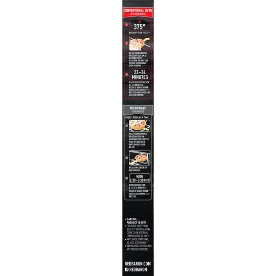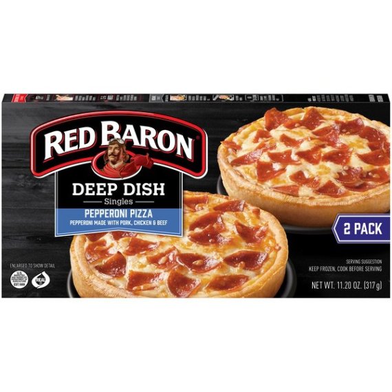 Details Ingredients Enriched Flour (Wheat Flour, Malted Barley Flour, Niacin, Reduced Iron, Thiamine Mononitrate, Riboflavin, Folic Acid), Water, Low Moisture Part Skim Mozzarella Cheese (Cultured Pasteurized Part Skim Milk, Salt, Enzymes), Pepperoni Made with Pork, Chicken, and Beef (Pork, Mechanically Separated Chicken, Beef, Salt, Contains 2% or Less of Spices, Dextrose, Lactic Acid Starter Culture, Sodium Ascorbate, Smoke Flavoring, Flavoring, Sodium Nitrite, BHA, BHT, Citric Acid), Contains One or More of: Water, Garlic Powder, Paprika, Oleoresin of Paptrika, Tomato Paste, Palm Oil, Contains 2% or Less of: Vegetable Oil (Soybean and/or Canola Oil), Sugar, Nonfat Milk, Salt, Yeast, Modified Food Starch, Spice, Maltodextrin, Dried Garlic, Hydrolyzed Soy and Corn Protein, Paprika, Dried Onion, Natural Flavor, Wheat Starch, Defatted Soy Flour, L-Cysteine Hydrochloride, Ammonium Sulfate, Soy Lecithin, Annatto (Color), Ascorbic Acid (Dough Conditioner). Show more Product features You’ll love every delicious bite of our RED BARON® Pepperoni Deep Dish Pizza. The classic pizza topping in the perfect size for lunch or dinner. RED BARON® Singles Pepperoni Deep Dish Pizza lets you enjoy the perfect pizza within minutes. Savor mouth watering, perfectly portioned pizza made with real cheese, robust tomato sauce, and premium toppings on our classic crust. Pizzas, Deep Dish, Pepperoni Pepperoni made with pork, chicken & beef. Premium quality. Real. US inspected and passed by Department of Agriculture. Recyclable. Recycling programs for this package may not exist in your area. For further information or questions contact us at 800-769-7980. www.Redbaron.com. Made in USA. Special Features 2 pizzas Net Quantity of Content 2.0 X 1 Pizza (159g)