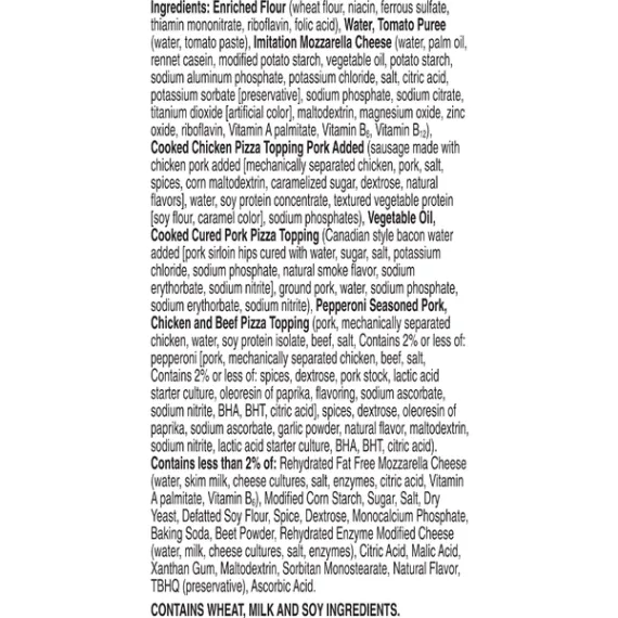 Details Ingredients Enriched Flour (Wheat Flour, Niacin, Ferrous Sulfate, Thiamin Mononitrate, Riboflavin, Folic Acid), Water, Tomato Puree (Water, Tomato Paste), Imitation Mozzarella Cheese (Water, Palm Oil, Rennet Casein, Modified Potato Starch, Vegetable Oil, Potato Starch, Sodium Aluminum Phosphate, Potassium Chloride, Salt, Citric Acid, Potassium Sorbate [Preservative], Sodium Phosphate, Sodium Citrate, Titanium Dioxide [Artificial Color], Maltodextrin, Magnesium Oxide, Zinc Oxide, Riboflavin, Vitamin A Palmitate, Vitamin B6, Vitamin B12), Cooked Chicken Pizza Topping Pork Added (Sausage Made with Chicken Pork Added [Mechanically Separated Chicken, Pork, Salt, Spices, Corn Maltodextrin, Caramelized Sugar, Dextrose, Natural Flavors], Water, Soy Protein Concentrate, Textured Vegetable Protein [Soy Flour, Caramel Color], Sodium Phosphates), Vegetable Oil, Cooked Cured Pork Pizza Topping (Canadian Style Bacon Water Added [Pork Sirloin Hips Cured with Water, Sugar, Salt, Potassium Chloride, Sodium Phosphate, Natural Smoke Flavor, Sodium Erythorbate, Sodium Nitrite], Ground Pork, Water, Sodium Phosphate, Sodium Erythorbate, Sodium Nitrite), Pepperoni Seasoned Pork, Chicken and Beef Pizza Topping (Pork, Mechanically Separated Chicken, Water, Soy Protein Isolate, Beef, Salt, Contains 2% or Less of: Pepperoni [Pork, Mechanically Separated Chicken, Beef, Salt, Contains 2% or Less of: Spices, Dextrose, Pork Stock, Lactic Acid Starter Culture, Oleoresin of Paprika, Flavoring, Sodium Ascorbate, Sodium Nitrite, BHA, BHT, Citric Acid], Spices, Dextrose, Oleoresin of Paprika, Sodium Ascorbate, Garlic Powder, Natural Flavor, Maltodextrin, Sodium Nitrite, Lactic Acid Starter Culture, BHA, BHT, Citric Acid). Contains Less than 2% of: Rehydrated Fat Free Mozzarella Cheese (Water, Skim Milk, Cheese Cultures, Salt, Enzymes, Citric Acid, Vitamin A Palmitate, Vitamin B6), Modified Corn Starch, Sugar, Salt, Dry Yeast, Defatted Soy Flour, Spice, Dextrose, Monocalcium Phosphate, Baking Soda, Beet Powder, Rehydrated Enzyme Modified Cheese (Water, Milk, Cheese Cultures, Salt, Enzymes), Citric Acid, Malic Acid, Xanthan Gum, Maltodextrin, Sorbitan Monostearate, Natural Flavor, TBHQ (Preservative), Ascorbic Acid. Show more Product features A unique crust that is flakier and crispier than baked crusts. Totino's pizza is the perfect shape for toaster oven preparation or Totino's pizza is the perfect shape for toaster oven preparation! Did you read that?! FOUR PIZZAS INSIDE!! Party Pizza: Your favorite classic, affordable, "to share or not to share?" frozen pizza Made from Goodness: Made with pork, chicken and beef with a unique crust that is flakier and crispier than baked crusts Convenient Size: Totino's pizza is the perfect shape for toaster oven preparation and conveniently two pizzas fit on a baking sheet Try Them All: Available in a number of varieties, including cheese, pepperoni, and combination Contains: A package with 4, 10.9 oz. Triple Meat Pizzas Net Quantity of Content 8 X 1/2 pizza (149g)