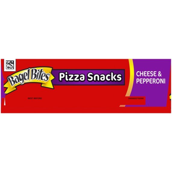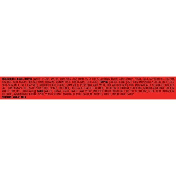 Details Ingredients Ingredients: Bagel Halves (Enriched Flour [Wheat Flour, Enzyme, Ascorbic Acid, Niacin, Reduced Iron, Thiamine Mononitrate, Riboflavin, Folic Acid], Water, Salt, Invert Cane Syrup, Yeast, Soybean Oil), Topping (Cheese Blend [Part Skim Mozzarella Cheese (Part Skim Milk, Cheese Cultures, Salt, Enzymes), Modified Food Starch, Skim Milk], Diced Pepperoni Made With Pork, Chicken And Smoke Flavor Added [Pork, Mechanically Separated Chicken, Salt, Spices, Water, Dextrose, Seasonings (Natural Spice Extractives, Extractives Of Paprika, Natural Smoke Flavor, Bha, Bht And Citric Acid), Lactic Acid Starter Culture, Sodium Nitrite]), Sauce (Water, Tomato Paste, Invert Cane Syrup, Modified Food Starch, Salt, Methyl Cellulose, Citric Acid, Potassium Chloride, Ammonium Chloride, Spice, Yeast Extract, Natural Flavor, Calcium Lactate), Water, Invert Cane Syrup. Contains: Wheat, Milk. Show more Product features Bagel Bites Cheese & Pepperoni Mini Bagels offer a quick and easy snack that kids love and parents can easily serve. The baked mini pizza bagels are topped with cheese, pepperoni and sauce for a mouthwatering flavor that excites taste buds. Snack time is always a hit when you serve these mini pizzas at a party or as an after school snack. These Bagel Bites have 7 grams of protein per serving and contain no trans fat per serving, artificial flavors or high fructose corn syrup. Bake them in the oven or toaster oven for a crispy finish, or microwave them for a quick snack. Each 18 count box of Bagel Bites Cheese & Pepperoni Mini Bagels includes a convenient microwavable crisping tray for easy prep. Keep frozen until ready to eat. One 18 ct. box of Bagel Bites Cheese & Pepperoni Mini Bagels Bagel Bites Cheese & Pepperoni Mini Bagels are an easy and fun snack Delicious mini bagels are made with cheese, pepperoni and tomato sauce Pizza bagels contain no high fructose corn syrup 7 g. of protein per serving Comes with convenient crisping tray for easy microwaving Keep frozen until ready to eat Special Features Real cheese Net Quantity of Content 4.5 X 4 pieces (88g)