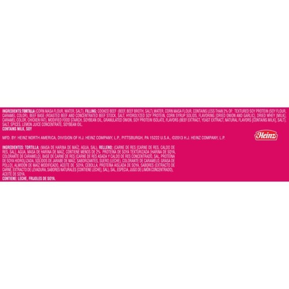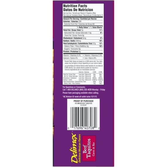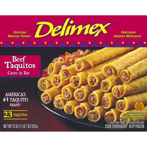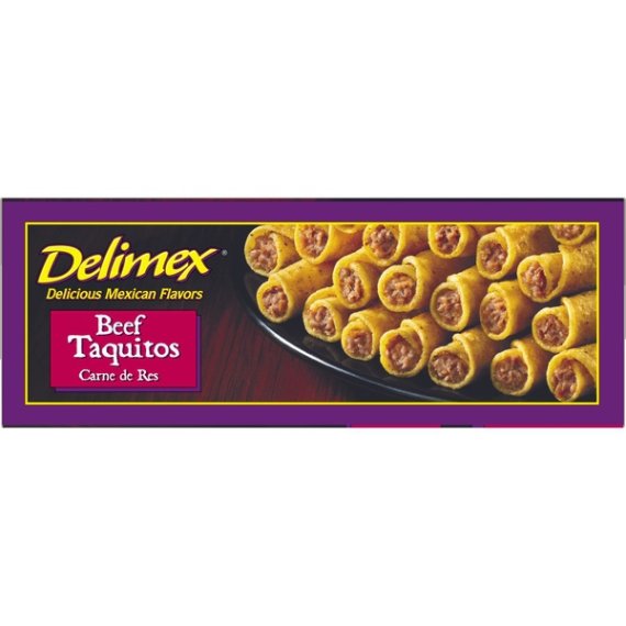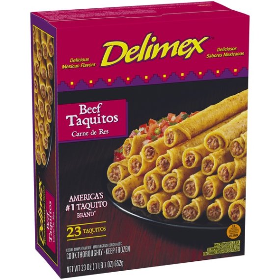 Details Ingredients Ingredients: Tortilla (Corn Masa Flour, Water, Salt), Filling: Cooked Beef (Beef, Beef Broth, Salt),Water, Corn Masa Flour, Contains Less Than 2% Of: Textured Soy Protein (Soy Flour, Caramel Color), Beef Base (Roasted Beef And Concentrated Beef Stock, Salt, Hydrolyzed Soy Protein, Corn Syrup Solids, Flavoring [Dried Onion And Garlic], Dried Whey [Milk], Caramel Color, Chicken Fat), Modified Food Starch, Soybean Oil, Granulated Onion, Soy Protein Isolate, Flavors (Beef Extract, Yeast Extract, Natural Flavors [Contains Milk], Salt), Salt, Spices, Lemon Juice Concentrate, Soybean Oil. Show more Product features Delimex Beef Corn Taquitos are made by America's #1 taquito brand to deliver that authentic Mexican flavor your family craves. Serve up these quick and easy microwave taquitos as fun after school snacks for the kids, or make them a tasty family meal on a busy weeknight. Delimex frozen taquitos also make a great party food when you're entertaining guests. Each of these beef taquitos is seasoned with spices and wrapped in a corn tortilla for delicious flavor. Simply microwave the easy appetizer for 1 minute and enjoy. Keep each 23 count box of Delimex Beef Corn Taquitos frozen until ready to prepare and enjoy. One 23 ct. box of Delimex Beef Corn Taquitos Delimex Beef Corn Taquitos from America's #1 taquito brand Taquitos make a perfect appetizer for parties Tasty beef rolled corn taquitos Taquitos with delicious Mexican flavor Store in the freezer Microwaveable for quick and easy preparation Special Features Microwaveable Net Quantity of Content 8.0 X 3 Taquitos(85g)