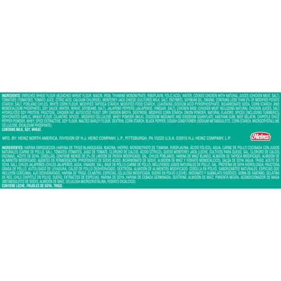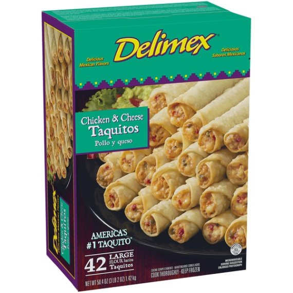 Details Ingredients Englishingredients: Enriched Wheat Flour (Bleached Wheat Flour, Niacin, Iron, Thiamine Mononitrate, Riboflavin, Folic Acid), Water, Cooked Chicken With Natural Juices (Chicken Meat, Salt), Tomatoes (Tomatoes, Tomato Juice, Citric Acid, Calcium Chloride), Monterey Jack Cheese (Cultured Milk, Salt, Enzymes), Soybean Oil, Onions, Contains Less Than 2% Of Modified Potato Starch , Salt , Poblano Chiles, White Corn Flour, Modified Tapioca Starch, Modified Food Starch, Leavening (Sodium Acid Pyrophosphate, Bicarbonate Soda, Corn Starch, And Monocalcium Phosphate), Soy Sauce (Water, Wheat, Soybeans, Salt), Jalapeno Peppers (Jalapenos, Vinegar, Salt), Chicken Base (Chicken Meat Including Natural Chicken Juices, Salt, Hydrolyzed Soy Protein, Fructose, Chicken Fat, Autolyzed Yeast, Dry Chicken Broth, Dextrose, Modified Corn Starch, Onion Powder, Natural Flavors, Spices [Including Turmeric]), Dehydrated Garlic, Wheat Flour, Cilantro, Spices , Modified Cellulose, Whey Powder (Milk), Disodium Inosinate And Disodium Guanylate, Xanthan Gum, Beef Gelatin, Chipotle Chile Pepper Powder, Whey , Spice Extractive , Soy Flour , Malted Barley Flour , Dextrin , Corn Starch, Black Pepper, Dough Conditioner (Sodium Metabisulfite, Corn Starch, Microcrystalline Cellulose, Dicalcium Phosphate). Show more Product features Delimex Chicken & Cheese Flour Taquitos are made by America's #1 taquito brand to deliver that authentic Mexican flavor your family craves. Serve up these quick and easy microwaveable taquitos as fun after school snacks for the kids, or make them a family meal on a busy weeknight. These frozen taquitos also make a perfect party food when you're entertaining guests. Each Delimex chicken and cheese taquito comes wrapped in a flour tortilla with spices and seasoning for bold flavor. Simply microwave the chicken taquitos for 1 minute and enjoy. Keep each 42 count box of Delimex Chicken & Cheese Flour Taquitos frozen until ready to prepare. One 42 ct. box of Delimex Chicken & Cheese Flour Taquitos Delimex Chicken & Cheese Flour Taquitos are from America's #1 taquito brand Large taquitos make a perfect appetizer for parties Tasty rolled chicken and cheese flour taquitos Serve as a full dinner or a quick snack Store in the freezer Microwaveable for quick and easy preparation Net Quantity of Content 21.0 X 2 Taquitos (68g)