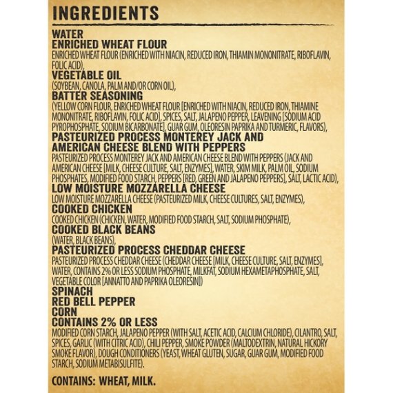 Details Ingredients Water Enriched Wheat Flour Enriched Wheat Flour (Enriched with Niacin, Reduced Iron, Thiamin Mononitrate, Riboflavin, Folic Acid), Vegetable Oil (Soybean, Canola, Palm, and/or Corn Oil), Batter Seasoning (Yellow Corn Flour, Enriched Wheat Flour [Enriched with Niacin, Reduced Iron Thiamin Mononitrate, Riboflavin, Folic Acid], Spices, Salt, Jalapeno Pepper, Leavening [Sodium Acid Pyrophosphate, Sodium Biacarbonate], Guar Gum, Oleoresin Paprika, and Tumeric, Flavors), Pasteurized Process Monterey Jack and American Cheese Blend with Peppers Pasteurized Process Monterey Jack and American Cheese Blend with Peppers (Jack and American Cheese [Milk, Cheese Culture, Salt, Enzymes], Water, Skim Milk, Palm Oil, Sodium Phosphates, Modified Food Starch, Peppers [Red, Green and Jalapeno Peppers], Salt, Lactic Acid), Low Moisture Mozzarella Cheese Low Moisture Mozzarella Cheese (Pasteurized Milk, Cheese Cultures, Salt, Enzymes), Cooked Chicken Cooked Chicken (Chicken, Water, Modified Food Starch, Salt, Sodium Phosphate), Cooked Black Beans (Water, Black Beans), Pasteurized Process Cheddar Cheese Pasteurized Process Cheddar Cheese (Cheddar Cheese [Milk, Cheese Culture, Salt, Enzymes], Water, Contains 2% or Less Sodium Phosphate, Milkfat, Sodium Hexametaphosphate, Salt, Vegetable Color [Annatto, and Paprika Oleoresin]) Spinach Red Bell Pepper Corn Contains 2% or Less Modified Corn Starch, Jalapeno Pepper (with Salt, Acetic Acid, Calcium Chloride), Cilantro, Salt, Spices, Garlic (with Citric Acid), Chili Pepper, Smoke Powder (Maltodextrin, Natural Hickory Smoke Flavor), Dough Conditioners (Yeast, Wheat Gluten, Sugar, Guar Gum, Modified Food Starch, Sodium Metabisulfite). Show more Product features El Monterey Simply Breakfast Egg, Turkey Sausage & Cheese Burritos are made with real scrambled eggs, seasoned turkey sausage & cheddar cheese wrapped in a fresh baked whole grain tortilla. The perfect breakfast for your busy family Over-sized XXL flavors High in Protien Authentic ingredients Oven-baked flour tortilla Ready in minutes out of the oven At El Monterey, we promise to bring you the best Mexican food - always. Family owned since 1964 Net Quantity of Content 7.0 X 3 Taquitos (98g)