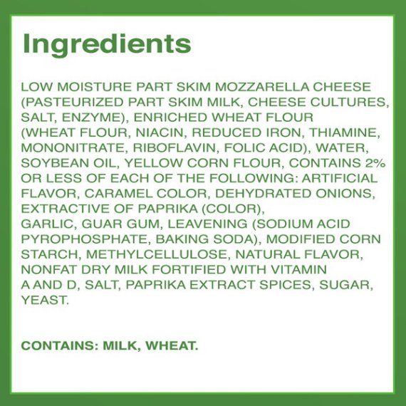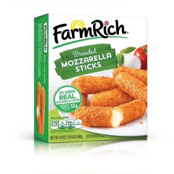 Details Ingredients LOW MOISTURE PART SKIM MOZZARELLA CHEESE (PASTEURIZED PART SKIM MILK, CHEESE CULTURES, SALT, ENZYMES), ENRICHED WHEAT FLOUR (WHEAT FLOUR, NIACIN, REDUCED IRON, THIAMINE MONONITRATE, RIBOFLAVIN, FOLIC ACID), WATER, SOYBEAN OIL, YELLOW CORN FLOUR, MODIFIED CORN STARCH, CONTAINS LESS THAN 2% OF THE FOLLOWING: ARTIFICIAL FLAVOR, CARAMEL (COLOR), DEHYDRATED GARLIC, DEHYDRATED ONIONS, GUAR GUM, LEAVENING (SODIUM ACID PYROPHOSPHATE, SODIUM BICARBONATE), METHYLCELLULOSE, NATURAL FLAVOR, NONFAT DRY MILK, PAPRIKA EXTRACT (COLOR), SALT, SPICES, SUGAR, YEAST. Show more Product features Farm Rich Breaded Mozzarella Sticks. Made with 100% real mozzarella cheese. These are delicious and wholesome snacks that you can make in a hurry without missing a moment! A good source of calcium and protein. Mozzarella Sticks, Breaded Made with 100% real mozzarella cheese. Per 2 Stick Serving: 180 calories; 4 g sat fat (20% DV); 420 mg sodium (17% DV); 1 g sugars. See nutrition information for sodium content. Marinara sauce not included. Real-life good. Good source of calcium. Good source of protein. 0 g trans fat per serving. Visit us at FarmRich.com. Facebook. Twitter. Pinterest. Instagram. Real families are busy, unpredictable and, well - perfectly imperfect. That's why we make delicious and wholesome snacks that you can make in a hurry without missing a moment! Net Quantity of Content ABOUT 12 X 57 g
