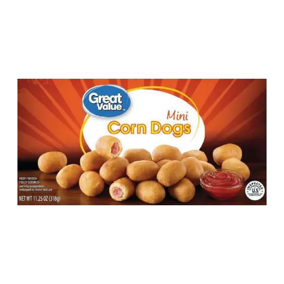 Details Ingredients BATTER INGREDIENTS: WATER, ENRICHED WHEAT FLOUR (WHEAT FLOUR, NIACIN, REDUCED IRON, THIAMINE MONONITRATE, RIBOFLAVIN, FOLIC ACID), SUGAR, DEGERMED YELLOW CORN MEAL. CONTAINS 2% OR LESS OF: LEAVENING (SODIUM ACID PYROPHOSPHATE, SODIUM BICARBONATE), SALT, SOYBEAN OIL, DEXTROSE, DRIED HONEY, ONION POWDER, SOY FLOUR, NONFAT MILK, EGGS, SOY LECITHIN. COOKED IN VEGETABLE OIL (CONTAINS ONE OR MORE OF: CORN OIL, COTTONSEED OIL, SOYBEAN OIL). CHICKEN FRANK INGREDIENTS: MECHANICALLY SEPARATED CHICKEN, WATER, DEXTROSE, SALT. CONTAINS 2% OR LESS OF: CORN SYRUP, FLAVORINGS, CALCIUM LACTATE, SODIUM PHOSPHATE, PAPRIKA AND PAPRIKA OLEORESIN, SODIUM ERYTHORBATE, SODIUM NITRITE. CASING MADE FROM CALCIUM ALGINATE. PREDUST INGREDIENTS: ENRICHED WHEAT FLOUR (ENRICHED WITH NIACIN, REDUCED IRON, THIAMINE MONONITRATE, RIBOFLAVIN, FOLIC ACID), WHEAT FLOUR, WHEY, SALT. Show more Product features Great Value Mini Corndogs are made with chicken franks that are wrapped in a lightly sweetened golden crust. These bite-size creations are just small enough to be ideal for finger foods, picnic and every day snacking. Children enjoy these smaller versions of corn dogs because they are easier for them to grab and handle, and there is no stick to get in the way. Serve with a side of ketchup, mustard or any other condiment for dipping. They are frozen so you can store them for a while until you are ready to eat. This box contains 16 of these delicious treats, making it the perfect size for entertaining. Enjoy the perfect balance of flavors in every bite with Great Value Mini Corn Dogs. Great Value products provide families with affordable, high-quality grocery and household consumable options. With our wide range of product categories spanning grocery and household consumables, we offer you a variety of products for your family's needs. Our products are conveniently available online and in Walmart stores nationwide, allowing you to stock up and save money at the same time. Great Value Mini Corn Dogs, 11.25 oz, 16 Count: Made with chicken franks Ideal snack for children Fully cooked USDA inspected Net Quantity of Content ABOUT 4 X 76 g