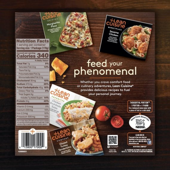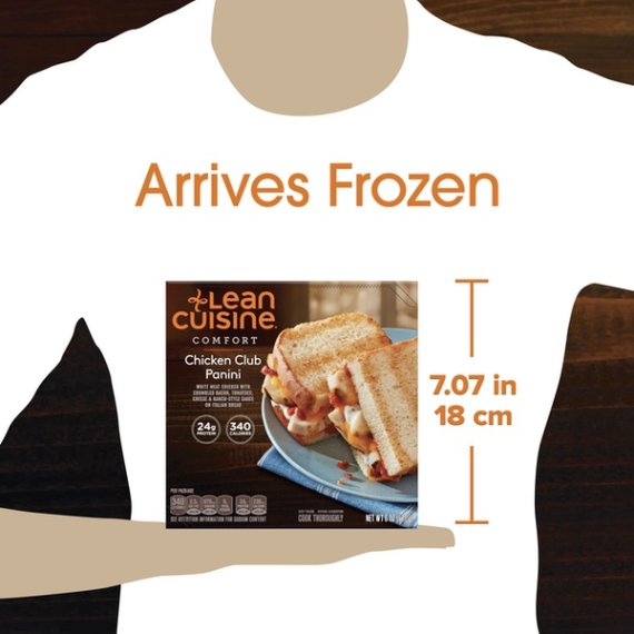 Details Ingredients Filling: Cooked White Meat Chicken (White Meat Chicken, Water, Isolated Soy Protein, Modified Rice Starch, Chicken Flavor [Dehydrated Chicken Broth, Chicken Powder, Natural Flavor], Sodium Phosphate, Salt), Light Pasteurized Process Cheddar Cheese (Cultured Milk and Skim Milk, Water, Potassium Citrate, Salt, Sodium Citrate, Whey*, Sorbic Acid [Preservative], Cream, Apocarotenal, and Beta Carotene [Color], Enzymes, Sodium Phosphate, Lactic Acid [*Ingredient not in Regular Pasteurized Process Cheddar Cheese]), Tomatoes, Water, Cooked Bacon (Bacon Cured with Water, Salt, Sugar, Dextrose, Sodium Erythorbate, Sodium Nitrite), Seasoning (Creamer [Sunflower Oil, Corn Syrup Solids, Sodium Caseinate, Mono & Diglycerides, Soy Lecithin], Buttermilk [Buttermilk, Whey, Sodium Caseinate, Lactic Acid], Whey, Modified Cornstarch, Skim Milk, Buttermilk Flavor [Maltodextrin, Lactic Acid, Modified Food Starch, Vinegar, Buttermilk Solids], Dried Garlic, Corn Syrup Solids, Sugar, Potassium Chloride, Lactic Acid, Salt, Xanthan Gum, Spice, Parsley, Less than 2% Soybean Oil Added as Anti-Caking Aid), White Distilled Vinegar., Bread: Bread (Enriched Flour [Wheat Flour, Malted Barley Flour, Reduced Iron, Niacin, Thiamin Mononitrate, Riboflavin, Folic Acid], Water, Sugar, Yeast, Oat Fiber, Soybean Oil, Cultured Wheat Starch, Grain Vinegar, Salt, Wheat Starch, Acetic Acid, Soy Lecithin, Citric Acid), Seasoning (Soybean Oil, Salt, Lactic Acid, Natural Flavor, Turmeric and Annatto Color), Natural Flavors.. Show more Product features A crispy, mouthwatering favorite, this delicious Chicken Club Panini is a panini you'll savor. A delectable blend of tender white meat chicken, crumbled bacon, tomatoes, and cheese on crispy Italian bread makes this sandwich the perfect meal to deliver the taste you hunger for. Go on, discover delicious and nutritious food made easy. Please see packaging for the most current Ingredient and Nutrition Fact Panel information. FLAVORFUL—Grab a handful of deliciousness with our LEAN CUISINE Chicken Club Panini. Try this delectable blend of tender white meat chicken, crumbled bacon, tomatoes, and cheese on crispy Italian bread. NUTRITION—Our crispy LEAN CUISINE Chicken Club Panini has 24g of protein and 7g of fat, with 340 total calories. INGREDIENTS—Our commitment to crafting great-tasting entrées begins by only using premium ingredients. VARIETY—Our chefs and nutritionists have carefully selected ingredients that purposefully deliver a variety of bold flavors and savory tastes in all of our entrées. CONVENIENT—Pressing start on your microwave means that great-tasting, easy-to-prepare meals are minutes away with Lean Cuisine frozen meals. Special Features 9G fat Net Quantity of Content 1.0 X 1 Package (170g)