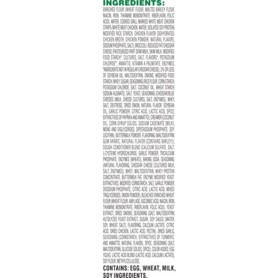 Details Ingredients Enriched Flour (Wheat Flour, Malted Barley Flour, Niacin, Iron, Thiamine Mononitrate, Riboflavin, Folic Acid), Water, Cooked Grill Marked White Meat Chicken Strips (White Meat Chicken, Water, Isolated Soy Protein, Modified Rice Starch, Chicken Flavor [Dehydrated Chicken Broth, Chicken Powder, Natural Flavor], Sodium Phosphate, Salt), Broccoli, Reduced Fat Cheddar Cheese (Pasteurized Part Skim Milk, Skim Milk, Modified Food Starch*, Cultures, Salt, Flavors*, Potassium Chloride*, Annatto, Vitamin A Palmitate, Enzymes, *Ingredients Not in Regular Cheddar Cheese), 2% or Less of Soybean Oil, Maltodextrin, Onions, Modified Food Starch, Whey, Sugar, Seasoning (Rice Flour, Corn Starch, Potassium Chloride, Salt, Coconut Oil, Wheat Starch, Sodium Alginate), Salt, Yeast, Seasoning (Cheddar/Blue Cheeses [Milk, Cheese Cultures, Salt, Enzymes], Whey, Salt, Dextrose, Dried Onion, Natural Flavor, Soybean Oil, Garlic Powder, Citric Acid, Lactic Acid, Spice, Extractives of Paprika and Annatto), Creamer (Coconut Oil, Corn Syrup Solids, Sodium Caseinate [Milk], Mono and Diglycerides, Dipotassium Phosphate, Soy Lecithin), Buttermilk Powder, Flavoring (Maltodextrin, Gum Arabic, Natural Flavor [Contains Barley]), Dough Conditioner Blend (Calcium Sulfate, Salt, L-Cysteine Hydrochloride, Garlic Powder, Tricalcium Phosphate, Enzymes [Wheat]), Baking Soda, Seasoning (Natural Flavoring, Cheddar Cheese [Cultured Milk, Salt, Enzymes], Whey, Maltodextrin, Whey Protein Concentrate, Buttermilk Fat, Enzyme Modified Yeast Extractives, Modified Cornstarch, Salt, Garlic Powder, Disodium Phosphate, Citric Acid, Lactic Acid, Mixed Triglycerides, Onion Powder), Bleached Enriched Wheat Flour (Wheat Flour, Amylase, Ascorbic Acid, Niacin, Iron, Thiamine Mononitrate, Riboflavin, Folic Acid), Yeast Extract, Dried Onions, Seasoning (Salt, Maltodextrin, Autolyzed Yeast Extract, Sugar, Soy Sauce [Water, Soy, Wheat, Salt], Flavoring, Calcium Lactate, Citric Acid, Dried Chicken, Lactic Acid, Pectin), Dried Garlic, Seasoning (Cornstarch, Extractives of Turmeric and Annatto, Natural Flavor), Spice, Seasoning (Salt, Maltodextrin, Glucose Solids, Spice), Color Added, Egg Yolks, Lactic Acid Blend (Lactic Acid, Calcium Lactate), Soy Flour, Methylcellulose. Show more Product features Get fired up with the protein and fuel of mouth-watering LEAN POCKETS sandwiches. Made with premium meats, 100% real cheese and no artificial flavors. Now that’s legit. 2 chicken, broccoli & cheddar hot pockets sandwiches White meat chicken, broccoli & cheddar cheese & sauce made with a whole grain crust Good source of protein Made with 100% real cheese No artificial flavors Our Hot Pockets sandwiches are made and simply frozen with breads baked daily and sauces made from scratch. Enjoy! Net Quantity of Content 2.0 X 1 Sandwich (120g)