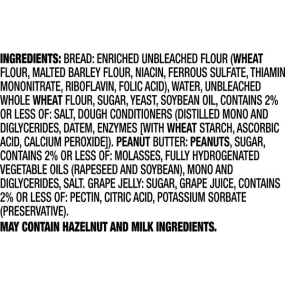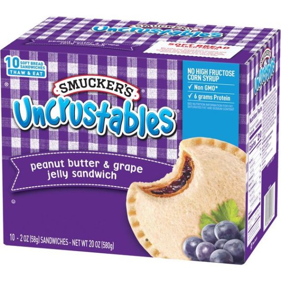Details Ingredients Bread: Enriched Unbleached Flour (Wheat Flour, Malted Barley Flour, Niacin, Ferrous Sulfate, Thiamin Mononitrate, Riboflavin, Folic Acid), Water, Unbleached Whole Wheat Flour, Sugar, Yeast, Soybean Oil, Contains 2% or Less of: Salt, Dough Conditioners (Distilled Mono and Diglycerides, DATEM, Enzymes [with Wheat Starch, Ascorbic Acid, Calcium Peroxide]). Peanut Butter: Peanuts, Sugar, Contains 2% or Less of: Molasses, Fully Hydrogenated Vegetable Oils (Rapeseed and Soybean), Mono and Diglycerides, Salt. Grape Jelly: Sugar, Grape Juice, Contains 2% or Less of: Pectin, Citric Acid, Potassium Sorbate (Preservative). Show more Product features Enjoy the classic, homemade taste of Smucker’s® Concord Grape Jelly and fresh-roasted Peanut Butter in a new way. Wherever you are, just thaw, unwrap, and enjoy. Perfect "grab-and-go" sandwich Homemade goodness of a peanut butter and jelly sandwich… without the crust! Thaw & eat Special Features No crust Net Quantity of Content 10.0 X 58 g