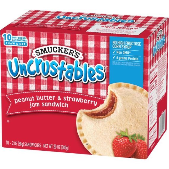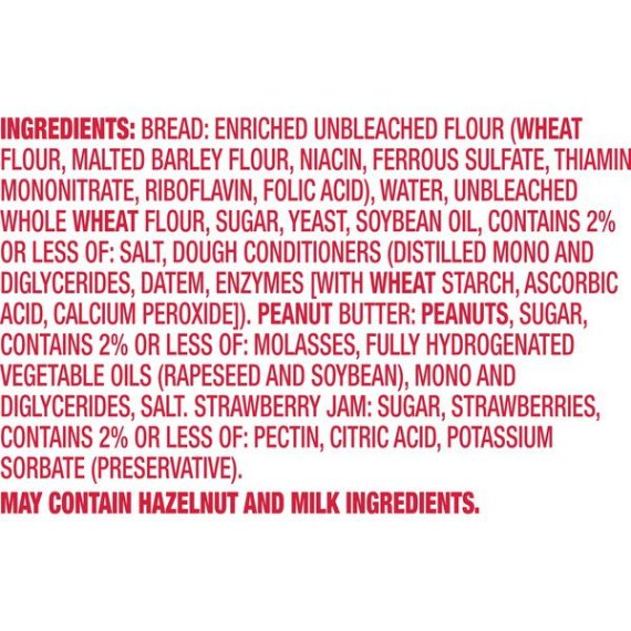 Details Ingredients Bread: Enriched Unbleached Flour (Wheat Flour, Malted Barley Flour, Niacin, Ferrous Sulfate, Thiamin Mononitrate, Riboflavin, Folic Acid), Water, Unbleached Whole Wheat Flour, Sugar, Yeast, Soybean Oil, Contains 2% or Less of: Salt, Dough Conditioners (Distilled Mono and Diglycerides, DATEM, Enzymes [with Wheat Starch, Ascorbic Acid, Calcium Peroxide]). Peanut Butter: Peanuts, Sugar, Contains 2% or Less of: Molasses, Fully Hydrogenated Vegetable Oils (Rapeseed and Soybean), Mono and Diglycerides, Salt. Strawberry Jam: Sugar, Strawberries, Contains 2% or Less of: Pectin, Citric Acid, Potassium Sorbate (Preservative). Show more Product features Creamy Peanut Butter and Smucker's Strawberry Jam crimped within a crustless pocket on wheat bread. Each wholesome soft bread sandwich is individually wrapped and frozen for optimal freshness and convenience. Perfect "grab-and-go" sandwich Homemade goodness of a peanut butter and jelly sandwich… without the crust! Thaw & eat Special Features No crust Net Quantity of Content 10.0 X 58 g