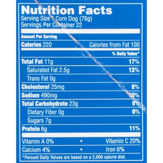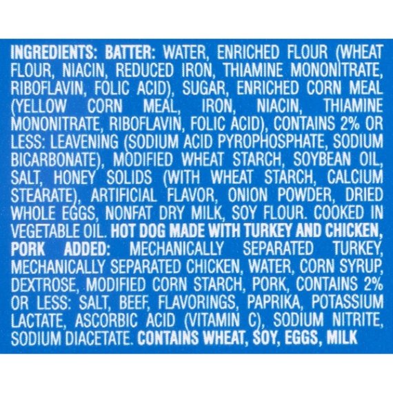 Details Ingredients BATTER: WATER, ENRICHED FLOUR (WHEAT FLOUR, NIACIN, REDUCED IRON, THIAMINE MONONITRATE, RIBOFLAVIN, FOLIC ACID), SUGAR, ENRICHED CORN MEAL (YELLOW CORN MEAL, IRON, NIACIN, THIAMINE MONONITRATE, RIBOFLAVIN, FOLIC ACID), CONTAINS 2% OR LESS: LEAVENING (SODIUM ACID PYROPHOSPHATE, SODIUM BICARBONATE), MODIFIED WHEAT STARCH, SOYBEAN OIL, SALT, HONEY SOLIDS (WITH WHEAT STARCH, CALCIUM STEARATE), ARTIFICIAL FLAVOR, ONION POWDER, DRIED WHOLE EGGS, NONFAT DRY MILK, SOY FLOUR. COOKED IN VEGETABLE OIL. HOT DOG MADE WITH TURKEY AND CHICKEN, PORK ADDED: MECHANICALLY SEPARATED TURKEY, MECHANICALLY SEPARATED CHICKEN, WATER, CORN SYRUP, DEXTROSE, MODIFIED CORN STARCH, PORK, CONTAINS 2% OR LESS: SALT, BEEF, FLAVORINGS, PAPRIKA, POTASSIUM LACTATE, ASCORBIC ACID (VITAMIN C), SODIUM NITRITE, SODIUM DIACETATE. Show more Product features Give your kid this State Fair® favorite: a super-yummy, batter-wrapped hot dog on a stick. State Fair® Classic Corn Dogs are made with real chicken, turkey, pork, and beef with no added hormones or steroids, then dipped in honey-sweetened batter for a kid-approved snack that moms will love as well. With 6 grams of protein per serving, our Classic Corn Dogs are a tasty way to give your kids the protein they need to help power their play. Simply microwave and serve with fruits and veggies for a delicious and well-balanced snack. Includes one package of 22 individually wrapped, fully cooked corn dogs. Did someone say playtime? We're ready. From the secret superhero fort in the backyard to the stuffed animal zoo in your basement, play is the most important thing in a kid's world. With State Fair® Corn Dogs, your kids get a good source of protein to keep the fun going. So line up the play dates, bring on the playgrounds, and play on. One package of 22 individually wrapped corn dogs Classic hot dog on a stick dipped in honey-sweetened batter Made with real chicken, turkey, pork, and beef and no added hormones or steriods 6 grams of protein per serving Fun and tasty way to help give your kids the fuel they need for their play Simply microwave and serve Serve with fruits and veggies for a delicious and well-balanced snack Special Features Microwaveable Net Quantity of Content 22 X 76 g