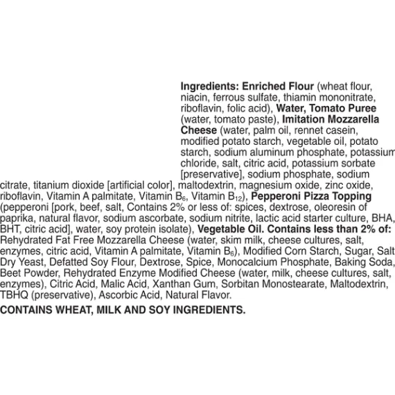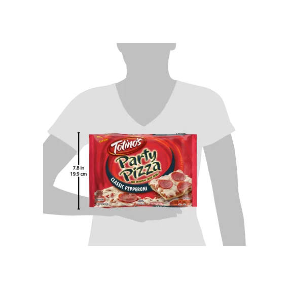 Details Ingredients Enriched Flour (Wheat Flour, Niacin, Ferrous Sulfate, Thiamin Mononitrate, Riboflavin, Folic Acid), Water, Tomato Puree (Water, Tomato Paste), Imitation Mozzarella Cheese (Water, Palm Oil, Rennet Casein, Modified Potato Starch, Vegetable Oil, Potato Starch, Sodium Aluminum Phosphate, Potassium Chloride, Salt, Citric Acid, Potassium Sorbate [Preservative], Sodium Phosphate, Sodium Citrate, Titanium Dioxide [Artificial Color], Maltodextrin, Magnesium Oxide, Zinc Oxide, Riboflavin, Vitamin A Palmitate, Vitamin B6, Vitamin B12), Pepperoni Pizza Topping (Pepperoni [Pork, Beef, Salt, Contains 2% or Less of: Spices, Dextrose, Oleoresin of Paprika, Natural Flavor, Sodium Ascorbate, Sodium Nitrite, Lactic Acid Starter Culture, BHA, BHT, Citric Acid], Water, Soy Protein Isolate), Vegetable Oil. Contains Less than 2% of: Rehydrated Fat Free Mozzarella Cheese (Water, Skim Milk, Cheese Cultures, Salt, Enzymes, Citric Acid, Vitamin A Palmitate, Vitamin B6), Modified Corn Starch, Sugar, Salt, Dry Yeast, Defatted Soy Flour, Dextrose, Spice, Monocalcium Phosphate, Baking Soda, Beet Powder, Rehydrated Enzyme Modified Cheese (Water, Milk, Cheese Cultures, Salt, Enzymes), Citric Acid, Malic Acid, Xanthan Gum, Sorbitan Monostearate, Maltodextrin, TBHQ (Preservative), Ascorbic Acid, Natural Flavor. Show more Product features A unique crust that is flakier and crispier than baked crusts. Totino's pizza is the perfect shape for toaster oven preparation or Totino's pizza is the perfect shape for toaster oven preparation! Party Pizza: Your favorite classic, affordable, "to share or not to share?" frozen pizza Made from Goodness: Made with pork, chicken and beef with a unique crust that is flakier and crispier than baked crusts Convenient Size: Totino's pizza is the perfect shape for toaster oven preparation and conveniently two pizzas fit on a baking sheet Try Them All: Available in a number of varieties, including cheese, pepperoni, and combination Contains: A package with a 10.4 Classic Pepperoni Pizza Net Quantity of Content 2 X ½ pizza (139g)
