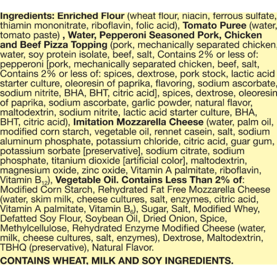 Details Ingredients Enriched Flour (Wheat Flour, Niacin, Ferrous Sulfate, Thiamin Mononitrate, Riboflavin, Folic Acid), Tomato Puree (Water, Tomato Paste), Water, Pepperoni Seasoned Pork, Chicken and Beef Pizza Topping (Pork, Mechanically Separated Chicken, Water, Soy Protein Isolate, Beef, Salt, Contains 2% or Less of: Pepperoni [Pork, Mechanically Separated Chicken, Beef, Salt, Contains 2% or Less of: Spices, Dextrose, Pork Stock, Lactic Acid Starter Culture, Oleoresin of Paprika, Flavoring, Sodium Ascorbate, Sodium Nitrite, BHA, BHT, Citric Acid], Spices, Dextrose, Oleoresin of Paprika, Sodium Ascorbate, Garlic Powder, Natural Flavor, Maltodextrin, Sodium Nitrite, Lactic Acid Starter Culture, BHA, BHT, Citric Acid), Imitation Mozzarella Cheese (Water, Palm Oil, Modified Corn Starch, Vegetable Oil, Rennet Casein, Salt, Sodium Aluminum Phosphate, Potassium Chloride, Citric Acid, Guar Gum, Potassium Sorbate [Preservative], Sodium Citrate, Sodium Phosphate, Titanium Dioxide [Artificial Color], Maltodextrin, Magnesium Oxide, Zinc Oxide, Vitamin A Palmitate, Riboflavin, Vitamin B12), Vegetable Oil, Contains Less than 2% of: Modified Corn Starch, Rehydrated Fat Free Mozzarella Cheese (Water, Skim Milk, Cheese Cultures, Salt, Enzymes, Citric Acid, Vitamin A Palmitate, Vitamin B6), Sugar, Salt, Modified Whey, Defatted Soy Flour, Soybean Oil, Dried Onion, Spice, Methylcellulose, Rehydrated Enzyme Modified Cheese (Water, Milk, Cheese Cultures, Salt, Enzymes), Dextrose, Maltodextrin, TBHQ (Preservative), Natural Flavor. Show more Product features Pepperoni Pizza in a crispy, golden, snackable crust. Pizza Rolls are easy to make and only take 60 seconds in the microwave. PIZZA ROLLS: A pizza in a crispy, golden, snackable crust QUICK AND EASY: Pizza Rolls are easy to make and only take 60 seconds in the microwave, go from Zero to Pizza Pronto CROWD PLEASER: A crowd-pleasing snack for parties or snack time and delicious on their own or paired with homemade dips TRY THEM ALL: Available in a number of varieties, including cheese, pepperoni, and combination Available in a number of varieties, including cheese, pepperoni, and combination Net Quantity of Content ABOUT 20 X 85.0