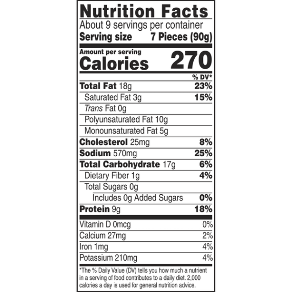 Details Ingredients WHITE MEAT CHICKEN, BLEACHED WHEAT FLOUR, WATER, WHEAT FLOUR, MODIFIED CORN STARCH, CONTAINS 2% OR LESS OF THE FOLLOWING: ANNATTO EXTRACT (COLOR), DEXTROSE, DISODIUM INOSINATE AND DISODIUM GUANYLATE, DRIED GARLIC, DRIED ONION, DRIED YEAST, HYDROLYZED CORN GLUTEN, LEAVENING (SODIUM BICARBONATE, SODIUM ACID PYROPHOSPHATE, SODIUM ALUMINUM PHOSPHATE, MONO CALCIUM PHOSPHATE), PAPRIKA EXTRACT (COLOR), SALT, SODIUM ALGINATE, SODIUM PHOSPHATES, SOY BEAN OIL, SPICES, SUGAR, YELLOW CORN FLOUR. FRIED IN VEGETABLE OIL. Show more Product features Take snack time to the next level with Tyson Any’tizers® Home-Style Chicken Fries. Made with white meat chicken and seasoned with a savory blend of spices, our chicken fries are the ideal shape for dunking into your favorite sauce. With 12 grams of protein per serving, this protein-filled snack will sure to be a favorite at your next party. Fully cooked and ready-to-eat, simply prepare in an oven or microwave and serve with BBQ sauce for a flavorful appetizer. Each package includes 28.05 oz. of Home-Style Chicken Fries. Everything seems to turn out a whole lot better when you just keep it simple. No nonsense. Just stick to the good stuff. The 100% real stuff that makes life, and chicken, great. With farm raised chicken of the highest quality, and no antibiotics ever, we keep it real in everything we do. Keep it real. Keep it Tyson. One 28.05 oz. package of Home-Style Chicken Fries Made with white meat chicken Breaded and seasoned with a savory blend of spices 12 grams of protein per serving No antibiotics ever Fully cooked and ready-to-eat Net Quantity of Content ABOUT 9 X 90 g
