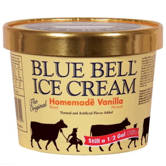 Details Ingredients Ingredients: Milk, cream, sugar, skim milk, high fructose corn syrup, natural and artificial vanilla flavor, cellulose gum, vegetable gums (guar, carrageenan, carob bean), salt, annatto color. Show more Product features Blue Bell Homemade Vanilla is our most popular ice cream and with good reason. It's rich, homemade-tasting vanilla ice cream with a special hand-crafted flavor that's the best in the country. Blue Bell Homemade Vanilla is packaged in a true 1/2 gallon container. Net Quantity of Content 16 X 0.5 cup