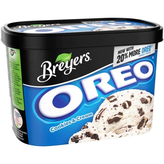 Details Ingredients MILK, OREO COOKIE PIECES {UNBLEACHED ENRICHED FLOUR [WHEAT FLOUR, NIACIN, REDUCED IRON, THIAMINE MONONITRATE (VITAMIN B1), RIBOFLAVIN (VITAMIN B2), FOLIC ACID], SUGAR, PALM AND/OR CANOLA OIL, COCOA (PROCESSED WITH ALKALI), HIGH FRUCTOSE CORN SYRUP, LEAVENING (BAKING SODA AND/OR CALCIUM PHOSPHATE), SALT, SOY LECITHIN, CHOCOLATE, VANILLIN - AN ARTIFICIAL FLAVOR}, CORN SYRUP, SUGAR, CREAM, HIGH FRUCTOSE CORN SYRUP, LESS THAN 2% OF: WHEY, VEGETABLE GUMS (GUAR, CAROB BEAN, TARA), MONO AND DIGLYCERIDES, NATURAL FLAVORS, VITAMIN A PALMITATE Show more Product features Breyers vanilla and heaps of Oreo® cookies? Yes please! If you’re anything like us, you love Breyers vanilla and Oreo® cookies. So why not combine your love into one tub with Breyers Oreo® Cookies & Cream? And now, there’s even MORE to swoon over with 20% more Oreo® cookie pieces in every tub! Really, who can say there’s ever too much of a good thing – like Oreo® cookies and ice cream? Rich, creamy vanilla goodness surrounds those chunks of real Oreo® cookies and will be sure to bring a smile to your face. We bet that if William Breyer, who started Breyers Ice Cream in 1866 in Philadelphia, could try Breyers Oreo® today, he would give it his stamp of approval. He was a champion of quality for the ice cream that he made, and we think he would agree that Breyers Oreo® is the cream of the crop! Using real Oreos® is just one way that we’re keeping to his pledge of quality. In fact, we’ve added loads of more of your favorite cookies and candies in our other cobranded products too, like Breyers SNICKERS®, Breyers REESE’S, and Breyers HEATH. Try them all and let us know your favorite at www.breyers.com! Breyers Frozen Dairy Dessert OREO Cookies & Cream 48 oz Breyers Oreo® - Oreo® cookies surrounded by Breyers vanilla. Enjoy a family-favorite cookie, Oreo®, in each creamy spoonful of Breyers vanilla. Now with 20% more Oreo® Cookie pieces! Partnering with American farmers for 100% Grade A milk and cream. Quality since 1866. Kosher dairy Special Features Artificial flavors Net Quantity of Content 12 X 1/2 cup