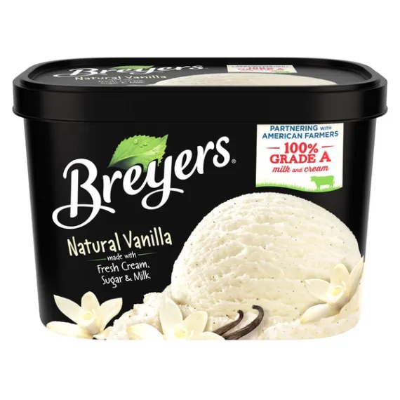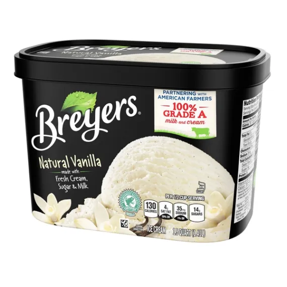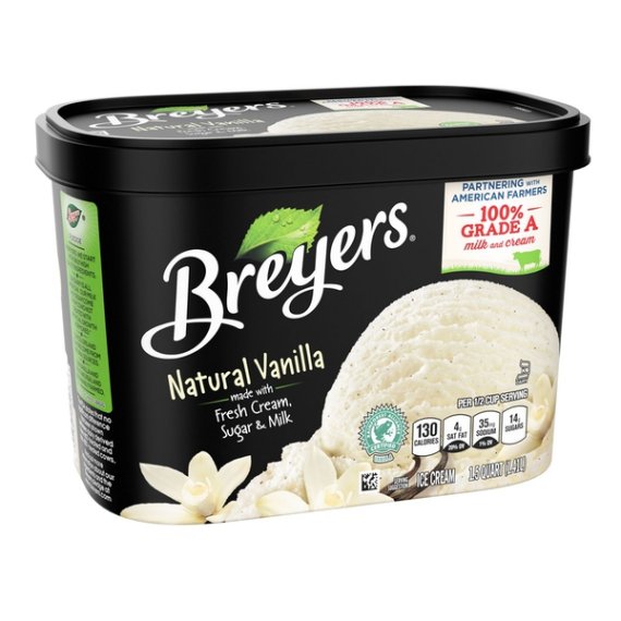 Details Ingredients MILK, CREAM, SUGAR, TARA GUM, VANILLA BEANS*, NATURAL FLAVOR, NATURAL VANILLA FLAVOR* Product features When William Breyer started his small ice cream business in Philadelphia in 1866, he based his recipes around simple and pure ingredients. Breyers Natural Vanilla ice cream today still holds true to his ideals. What could be simpler than using ingredients like fresh cream, sugar, and milk? To make things even sweeter, the milk and cream are 100% Grade A and come from American cows not treated with artificial growth hormones*. We partner with our farmers all over America because milk and fresh cream are so important in one of our most popular ice cream flavors and the taste you love.Do you see those specks? Those are real vanilla beans. That heavenly vanilla in Natural Vanilla is also 100% sustainably sourced, so you can enjoy it even more, knowing that you’re supporting farmers and their families in Madagascar through our partnership with the Rainforest Alliance. We believe that the quality of our ingredients makes the most delicious vanilla ice cream, and that’s why even today we keep true to William Breyers pledge of purity. Try Breyers Natural Vanilla yourself and see if you those vanilla specks and refreshing milk and cream can scoop up some smiles in your family. Want to give your dessert a twist? Check out our recipes at www.breyers.com/recipes for fun and easy ideas!* The FDA states that no significant difference has been shown between dairy derived from rBST-treated and non-rBST-treated cows. Breyers Original Natural Vanilla Ice Cream 48 oz Nothing beats the delicious taste of Breyers Natural Vanilla ice cream. It's the perfect pair to your favorite desserts! Ice cream made with sustainably farmed, Rainforest Alliance Certified vanilla beans & vanilla bean specks you can see! Partnering with American Farmers. 100% Grade A Milk and Cream. Made in accordance to our Breyers Pledge, starting with high quality ingredients like fresh cream, sugar & milk. Made with All American Dairy; with milk and cream from cows not treated with Artificial Growth Hormones** The FDA states that no significant difference has been shown between dairy derived from rBST-treated and non-rBST-treated cows. Gluten free and Kosher dairy. Special Features With real bean specks Net Quantity of Content 12 X 1/2 cup