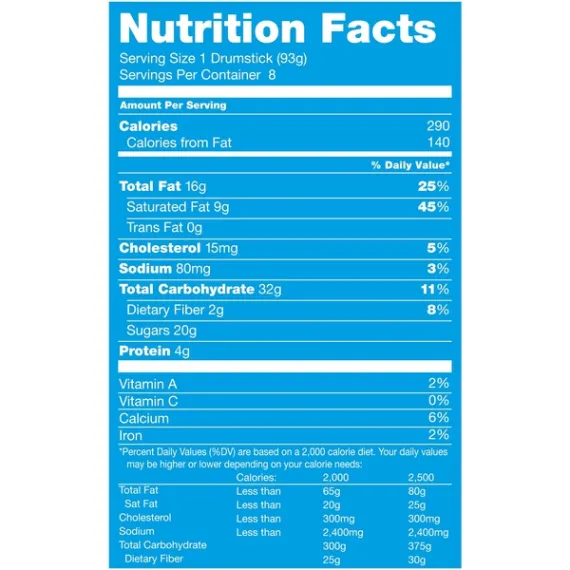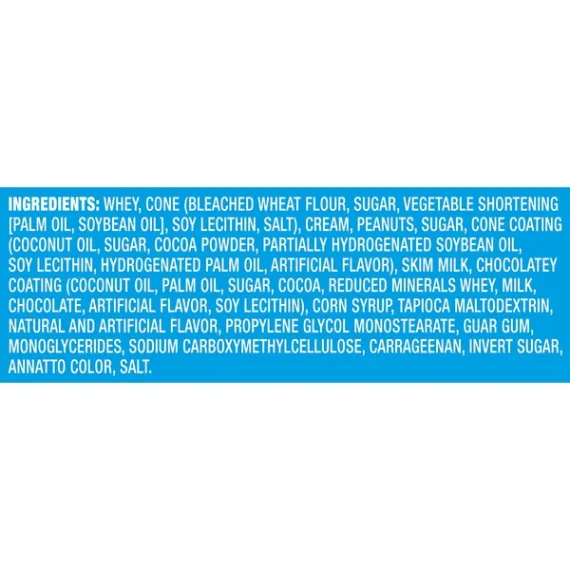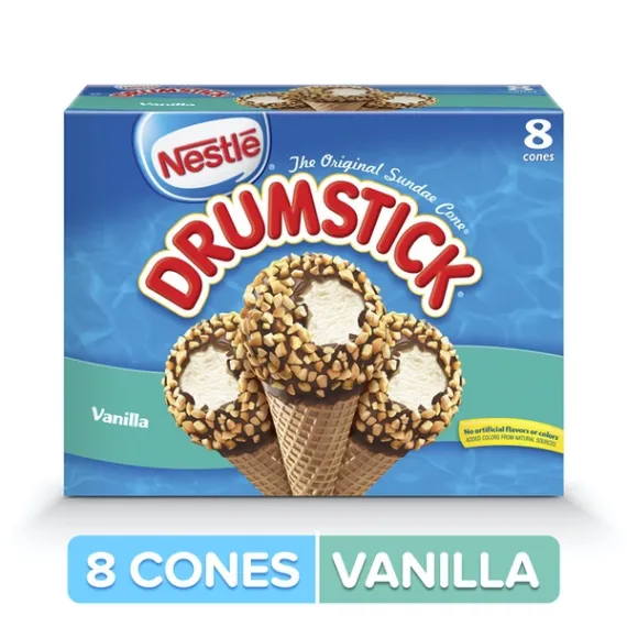 Details Ingredients Whey, Cone (bleached Wheat Flour, Sugar, Vegetable Shortening [palm Oil, Soybean Oil], Soy Lecithin, Salt), Cream, Peanuts, Sugar, Cone Coating (coconut Oil, Sugar, Cocoa Powder, Partially Hydrogenated Soybean Oil, Soy Lecithin, Hydrogenated Palm Oil, Artificial Flavor), Skim Milk, Chocolatey Coating (Coconut Oil, Palm Oil, Sugar, Cocoa, Reduced Minerals Whey, Milk, Chocolate, Soy Lecithin, Natural Flavor), Corn Syrup, Tapioca Maltodextrin, Propylene Glycol Monostearate, Guar Gum, Monoglycerides, Sodium Carboxymethylcellulose, Carrageenan, Natural And Artificial Flavor, Invert Sugar, Annatto Color, Salt. Show more Product features DRUMSTICK, the Original Sundae Cone, is one crunchy, sweet, indulgent cone of goodness. The Classic Vanilla cone has a creamy vanilla center and is covered in a velvety layer of chocolate and crunchy peanuts. Your eight-count box of DRUMSTICK cones is transported using a chilled shipping method to arrive frozen. Grab goodness by the cone. DRUMSTICK is the ORIGINAL SUNDAE CONE covered with peanuts and chocolate in a crispy sugar cone. Each box contains 8 delicious sundae cones A classic choice with roasted peanuts, creamy vanilla, and a surprising chocolatey finish that can charm the pickiest of taste buds Originally created in 1904, the DRUMSTICK sundae cone has evolved to delight fans for generations An iconic summer treat perfect for snacking any time of year Sundae cones are transported using a chilled shipping method to arrive frozen Special Features No Net Quantity of Content 8.0 X 1 Drumstick