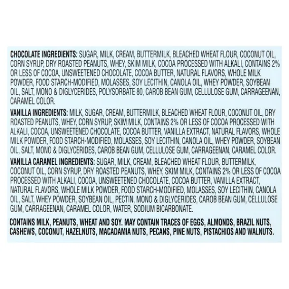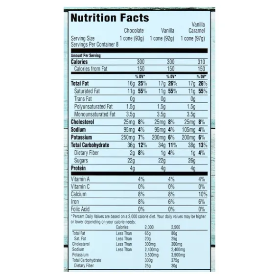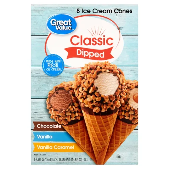 Details Ingredients Chocolate - Sugar, Milk, Cream, Buttermilk, Bleached Wheat Flour, Coconut Oil, Corn Syrup, Dry Roasted Peanuts, Whey, Skim Milk, Cocoa processed with Alkali, Contains 2% or less of Cocoa, Unsweetened Chocolate, Cocoa Butter, Natural Flavors, Whole Milk Powder, Food Starch-Modified, Molasses, Soy Lecithin, Canola Oil, Whey Powder, Soybean Oil, Salt, Mono & Diglycerides, Polysorbate 80, Carob Bean Gum, Cellulose Gum, Carrageenan, Caramel Color **Vanilla - Milk, Sugar, Cream, Buttermilk, Bleached Wheat Flour, Coconut Oil, Dry Roasted Peanuts, Whey, Corn Syrup, Skim Milk, Contains 2% or less of Cocoa processed with Alkali, Cocoa, Unsweetened Chocolate, Cocoa Butter, Vanilla Extract, Natural Flavors, Whole Milk Powder, Food Starch-Modified, Molasses, Soy Lecithin, Canola Oil, Whey Powder, Soybean Oil, Salt, Mono & Diglycerides, Carob Bean Gum, Cellulose Gum, Carrageenan, Caramel Color **Vanilla Caramel - Sugar, Milk, Cream, Bleached Wheat Flour, Buttermilk, Coconut Oil, Corn Syrup, Dry Roasted Peanuts, Whey, Skim Milk, Contains 2% or less of Cocoa processed with Alkali, Cocoa, Unsweetened Chocolate, Cocoa Butter, Vanilla Extract, Natural Flavors, Whole Milk Powder, Food Starch-Modified, Molasses, Soy Lecithin, Canola Oil, Salt, Whey Powder, Soybean Oil, Pectin, Mono & Diglycerides, Carob Bean Gum, Cellulose Gum, Carrageenan, Caramel Color, Water, Sodium Bicarbonate Show more Product features Great Value Classic Dipped Ice Cream Cones are classically delicious frozen dessert that is perfect treat to cool down on a hot summer day. This variety pack comes with all your favorite flavors including chocolate, vanilla and vanilla caramel. Each cone is topped with a chocolate coating and coated with peanuts for a satisfying crunch in every bite. They are perfect for picnics, backyard barbecues, family gatherings and everyday snacking. Brighten up any day with a Classic Dipped Ice Cream Cone by Great Value. Great Value products provide families with affordable, high-quality grocery and household consumable options. With our wide range of product categories spanning grocery and household consumables, we offer you a variety of products for your family's needs. Our products are conveniently available online and in Walmart stores nationwide, allowing you to stock up and save money at the same time. Great Value Classic Dipped Ice Cream Cones, 36 oz, 8 Count: Variety pack includes chocolate, vanilla and vanilla caramel Cones dipped in chocolate and topped with crunchy peanuts Perfect for summer parties Includes 8 cones