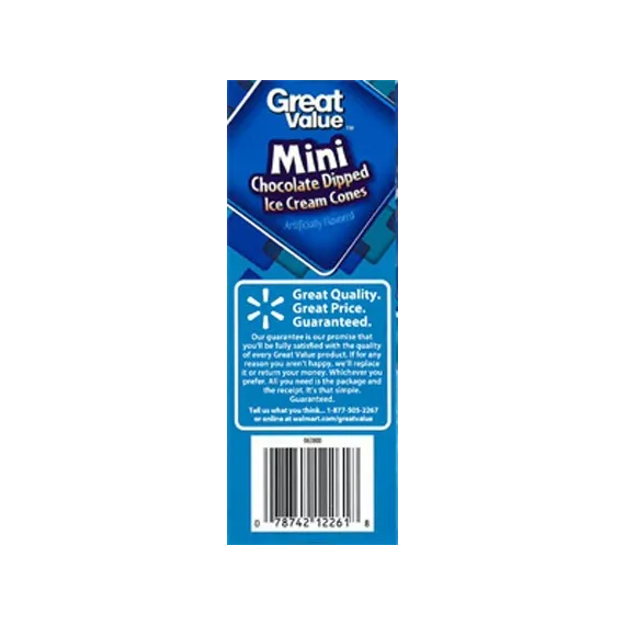 Details Ingredients Ice Cream (Milk, Cream, Buttermilk, Sugar, Corn Syrup, Whey, Contains 1% or Less of Mono- and Diglycerides, Guar Gum, Calcium Sulfate, Vanilla Extract, Carob Bean Gum, Artificial Flavor, Cellulose Gum, Carrageenan, Annatto for Color), Cone and Cone Pieces (Bleached Wheat Flour, Sugar, Molasses, Vegetable Shortening [Soybean and/or Palm Oil]), Partially Hydrogenated Vegetable Oil (Soybean, Cottonseed), Salt, Soy Lecithin, Caramel Color). Chocolate Flavored Coating (Coconut Oil, Sugar, Cocoa, Chocolate Liquor, Whey, Whole Milk Powder, Cocoa Butter, Soybean Oil, Cocoa Processed with Alkali, Soy Lecithin, Salt, Vanillin). Dry Roasted Peanuts. Show more Product features Great Value Mini Chocolate Dipped Ice Cream Cones are a classically delicious dessert that is a fun treat for kids and adults alike. This delightful treat is made with vanilla flavored ice cream in a sugar cone, dipped in chocolate flavored coating, topped with peanuts and cone crunch. Great Value Mini Chocolate Dipped Ice Cream Cones are perfect for kids' birthday parties, for pool parties, summer barbecues, for the office or a sweet treat to indulge on any day. This box comes with 10 ice cream cones so it is easy to stock up or share with friends. Put a smile on your loved ones face with a Great Value Mini Chocolate Dipped Ice Cream Cones. Great Value products provide families with affordable, high-quality grocery and household consumable options. With our wide range of product categories spanning grocery and household consumables, we offer you a variety of products for your family's needs. Our products are conveniently available online and in Walmart stores nationwide, allowing you to stock up and save money at the same time. Great Value Mini Chocolate Dipped Ice Cream Cones, 22.5 oz, 10 Count: Vanilla flavored ice cream in a sugar cone, dipped in chocolate flavored coating topped with peanuts and cone crunch Perfect for kids' birthday parties, for pool parties, summer barbecues, for the office or a sweet treat any day Contains 10, 2.25 oz sandwiches Classic dessert Special Features Artificial flavor added Net Quantity of Content 10 X 44.00 g