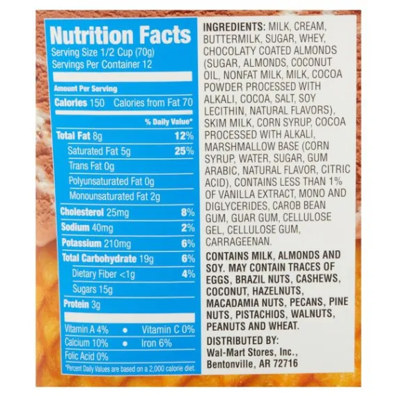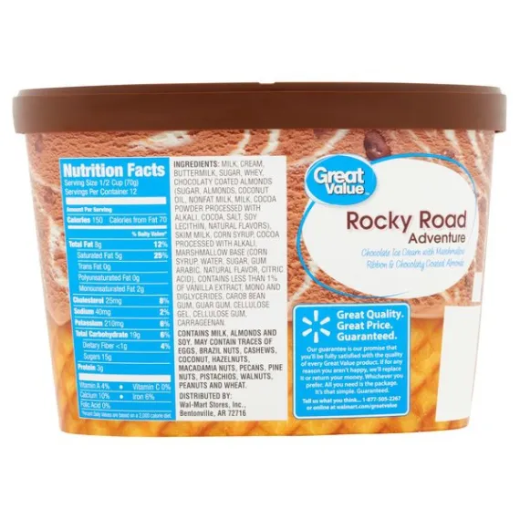 Details Ingredients MILK, CREAM, BUTTERMILK, SUGAR, WHEY, CHOCOLATY COATED ALMONDS (SUGAR, ALMONDS, COCONUT OIL, NONFAT MILK, MILK, COCOA POWDER PROCESSED WITH ALKALI, COCOA, SALT, SOY LECITHIN, NATURAL FLAVORS), CORN SYRUP, COCOA PROCESSED WITH ALKALI, MARSHMALLOW BASE (CORN SYRUP, WATER, SUGAR, GUM ARABIC, NATURAL FLAVOR, CITRIC ACID), SKIM MILK, CONTAINS 1% OR LESS OF NATURAL FLAVORS, MONO AND DIGLYCERIDES, CAROB BEAN GUM, GUAR GUM, CELLULOSE GEL, CELLULOSE GUM, CARRAGEENAN. Show more Product features Great Value Rocky Road Ice Cream is a classically delicious dessert that is a fun treat for kids and adults alike. This delightful treat is made with classic chocolate ice cream that is loaded with marshmallow ribbon and chocolaty coated almonds. Indulge in this sweet treat straight from the tub or scoop into a waffle cone or ice cream bowl. Enjoy it as is or top with sprinkles, chocolate syrup, almonds, whipped cream or a maraschino cherry. This ice cream is also perfect for homemade milkshakes. It comes with three pounds of ice cream, making it easy to stock up. Put a smile on your loved ones face with a scoop of Great Value Rocky Road Ice Cream. Great Value products provide families with affordable, high-quality grocery and household consumable options. With our wide range of product categories spanning grocery and household consumables, we offer you a variety of products for your family's needs. Our products are conveniently available online and in Walmart stores nationwide, allowing you to stock up and save money at the same time. Great Value Rocky Road Ice Cream, 48 oz: Chocolate ice cream with marshmallow ribbon and chocolaty coated almonds Enjoy in a waffle cone or straight from the tub Top with sprinkles, chocolate syrup, almonds, whipped cream or a maraschino cherry Perfect for homemade milkshakes Special Features No Net Quantity of Content 9 X 2/3 cup