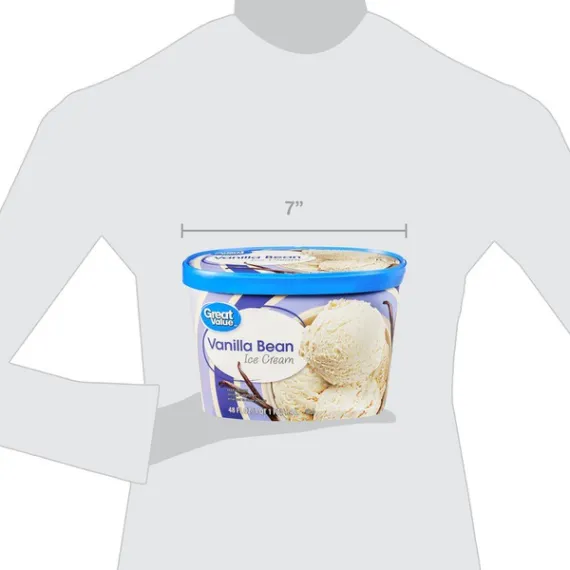 Details Ingredients MILK, SKIM MILK, CREAM SUGAR, CONTAINS 1% OR LESS OF VANILLA EXTRACT, GROUND VANILLA BEANS, CELLULOSE GEL, CELLULOSE GUM, CARRAGEENAN, CAROB BEAN GUM. Show more Product features Great Value Vanilla Bean Ice Cream is a classically delicious dessert that is a fun treat for kids and adults alike. Indulge in this sweet treat straight from the tub or scoop into a waffle cone or ice cream bowl. Enjoy it as is or top with sprinkles, chocolate syrup, almonds, whipped cream and a maraschino cherry. This ice cream is also perfect for a classic homemade milkshakes and smoothies. It comes with three pounds of ice cream, making it easy to stock up. Put a smile on your loved ones face with a scoop of Great Value Vanilla Bean Ice Cream. Great Value products provide families with affordable, high-quality grocery and household consumable options. With our wide range of product categories spanning grocery and household consumables, we offer you a variety of products for your family's needs. Our products are conveniently available online and in Walmart stores nationwide, allowing you to stock up and save money at the same time. Great Value Vanilla Bean Ice Cream, 48 fl oz: Classic vanilla ice cream Enjoy in a waffle cone or straight from the tub Top with sprinkles, chocolate syrup, almonds, whipped cream or a maraschino cherry Perfect for homemade milkshakes Special Features All natural Net Quantity of Content 12 X 0.5 cup