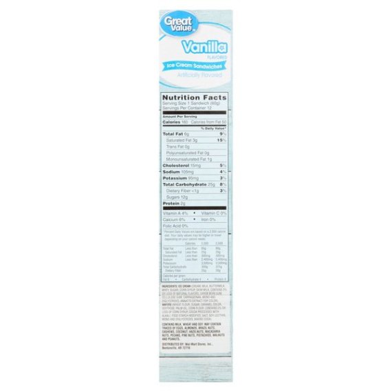 Details Ingredients ICE CREAM (CREAM, MILK, BUTTERMILK, WHEY, SUGAR, CORN SYRUP, SKIM MILK, CONTAINS 2% OR LESS OF NATURAL FLAVORS, CAROB BEAN GUM, CELLULOSE GUM, CARRAGEENAN, MONO AND DIGLYCERIDES, ANNATTO EXTRACT FOR COLOR). WAFERS (WHEAT FLOUR, SUGAR, CARAMEL COLOR, DEXTROSE, PALM OIL, CORN FLOUR, CONTAINS 2% OR LESS OF CORN SYRUP, COCOA PROCESSED WITH ALKALI, FOOD STARCH-MODIFIED, SALT, SOY LECITHIN, MONO AND DIGLYCERIDES, BAKING SODA). Show more Product features Great Value Vanilla Ice Cream Sandwiches are a classically delicious dessert that is a fun treat for kids and adults alike. This delightful treat is made with vanilla flavored ice cream between two chocolate flavored wafers. Great Value ice cream sandwiches are perfect for kids' birthday parties, for pool parties, summer barbecues, for the office or a sweet treat to indulge on any day. This box comes with 12 ice cream sandwiches so it is easy to stock up or share with friends. Put a smile on your loved ones face with a Great Value Vanilla Ice Cream Sandwich. Great Value products provide families with affordable, high-quality grocery and household consumable options. With our wide range of product categories spanning grocery and household consumables, we offer you a variety of products for your family's needs. Our products are conveniently available online and in Walmart stores nationwide, allowing you to stock up and save money at the same time. Great Value Vanilla Flavored Ice Cream Sandwiches, 42 oz, 12 Count: Vanilla flavored ice cream between two chocolate flavored wafers Perfect for kids' birthday parties, for pool parties, summer barbecues, for the office or a sweet treat any day Contains 12, 3.5 oz sandwiches Classic dessert Special Features No Net Quantity of Content 12 X 60 g