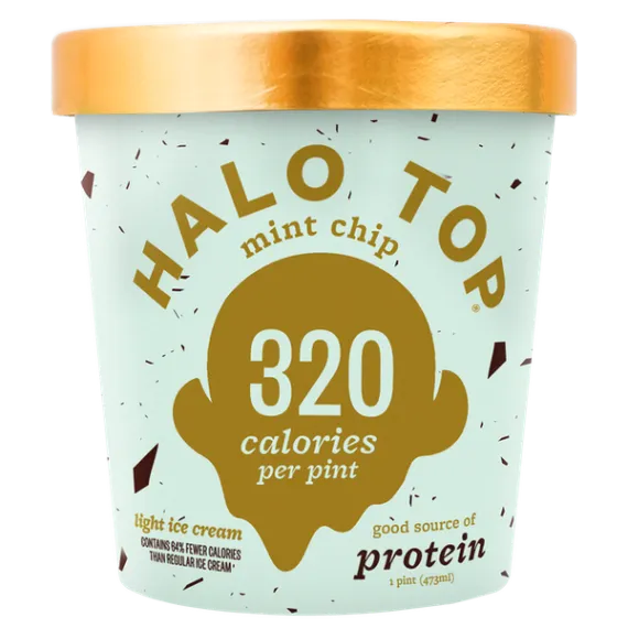 Details Ingredients SKIM MILK, EGGS, ERYTHRITOL, PREBIOTIC FIBER, MILK PROTEIN CONCENTRATE, CREAM, ORGANIC CANE SUGAR, CHOCOLATE CHIPS (COCOA MASS, SUGAR, COCOA BUTTER, MILK FAT, VANILLA EXTRACT), VEGETABLE GLYCERIN, NATURAL FLAVORS, SEA SALT, ORGANIC CAROB GUM, ORGANIC GUAR GUM, ORGANIC STEVIA LEAF EXTRACT. Show more Product features Halo Top Mint Chip Ice Cream offers a guilt-free way to indulge your sweet tooth. Halo Top ice cream is a good source of protein. It's also low-calorie and low-sugar. The brand uses high-quality, all-natural ingredients to craft each recipe so that it tastes just like regular ice cream. Dig in and see for yourself just how good healthy ice cream can be. This Halo Top protein ice cream has 5g per serving, which can help keep your body fueled. The rich chocolate chips complement the cool flavor of the mint ice cream. Halo Top also comes in many other flavors, so you can satisfy every craving (each available separately). Enjoy it as-is or top the ice cream with chocolate syrup, fruit and other flavors. Halo Top Mint Chip Ice Cream: Entire pint has just 240 calories Good source of protein Low-sugar ice cream with mint chip flavor Low-carb Low-fat No synthetic growth hormones (GMO-free) Kosher dairy Certified gluten-free Net Quantity of Content 4 X 1/2 Cup (64g)