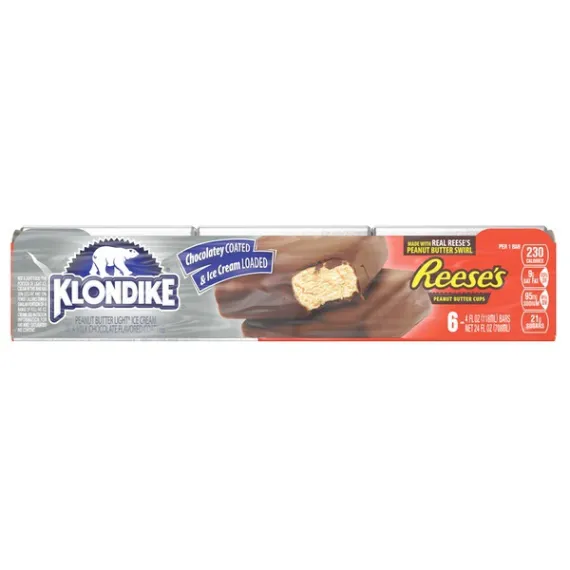 Details Ingredients NONFAT MILK, MILK CHOCOLATE FLAVORED COATING [SUGAR, COCONUT OIL, CHOCOLATE (PROCESSED WITH ALKALI), MILK, WHEY, SOYBEAN OIL, COCOA (PROCESSED WITH ALKALI), SOY LECITHIN, SALT, ARTIFICIAL FLAVOR], REESE’S PEANUT BUTTER SWIRL [PEANUTS, SUGAR, PEANUT OIL, DEXTROSE, SALT, TBHQ (PRESERVATIVE)], SUGAR, CORN SYRUP, CREAM, LESS THAN 2% OF: WHEY, MONO AND DIGLYCERIDES, CARAMEL (FOR COLOR), LOCUST BEAN GUM, GUAR GUM, VITAMIN A PALMITATE, CARRAGEENAN Show more Product features Reese's peanut butter cups join forces with Klondike bars to create the perfect frozen snack—yes please! Klondike Reese's Ice Cream Bars 6 ct has Reese's peanut butter flavored smooth light ice cream with Reese's Peanut Butter Cups coated in our famous milk chocolate flavored coating. All the peanut butter deliciousness you would expect from Reese’s, now in a tasty frozen treat. You know that it’s a Klondike ice cream bar when you open that silver foil, and hear the “crack” as you bite into its chocolatey shell, which holds in all of that delicious, ice-creamy goodness. This piece of stickless, bowl-and-spoonless perfection lets you enjoy the wonderful wonders of ice cream anytime, anywhere. Take the time to treat yourself. We know that life isn’t always as easy as it should be, so reward yourself for doing that thing you just did. Klondike supports you! Have Klondike as a snack. Have it as a treat. Have it to relax. Just have it…and give your mouth some sweet satisfaction. Try Klondike ice cream bars in 14 flavors, for unlimited deliciousness. They are all chocolatey coated, and ice cream loaded, with milk and cream from American cows that are not treated with artificial growth hormones*. Klondike Ice Cream Bars Reese's 6 ct 4.0 oz Klondike Reese's Ice Cream Bar Signature Creamy Reese's Flavored Light Ice Cream Coated in a Thick, Chocolatey Shell An American Classic Ice Cream Snack That You Would Do Anything For Available in 14 Unique Flavors for Unlimited Deliciousness 6-Pack For Those Moments When You Want to Share Perfect as a Hearty Snack, a Mid-Day Break from Your Co-Workers or Treat With Friends and Family Special Features No Net Quantity of Content 6 X 78 g