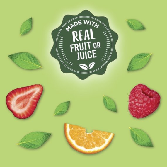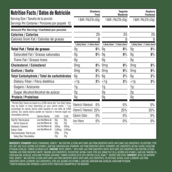 Details Ingredients Strawberry: Water, Strawberries, Sorbitol**, Maltodextrin, Glycerin, White Grape Juice from Concentrate (Water, White Grape Juice Concentrate), Polydextrose, Citric Acid, Beet Juice Color, Ascorbic Acid (Vitamin C), Guar Gum, Carob Bean Gum, Strawberry Juice from Concentrate (Water, Strawberry Juice Concentrate), Natural Flavors, Acesulfame Potassium, Sucralose, Turmeric Oleoresin Color. Tangerine: Water, Sorbitol**, White Grape Juice from Concentrate (Water, White Grape Juice Concentrate), Maltodextrin, Glycerin, Tangerine Juice from Concentrate (Water, Tangerine Juice Concentrate), Polydextrose, Natural Flavor, Citric Acid, Orange Pulp Cells, Ascorbic Acid (Vitamin C), Guar Gum, Tangerine Oil, Carob Bean Gum, Sucralose, Acesulfame Potassium, Gum Arabic, Turmeric Oleoresin Color, Beta Carotene (Color), Isomalt**, Modified Corn Starch. Raspberry: Water, Red Raspberry Puree, Sorbitol**, Maltodextrin, Glycerin, White Grape Juice from Concentrate (Water, White Grape Juice Concentrate), Polydextrose, Natural Flavor, Elderberry Juice from Concentrate (Water, Elderberry Juice Concentrate), Citric Acid, Ascorbic Acid (Vitamin C), Guar Gum, Carob Bean Gum, Sucralose, Acesulfame Potassium. **Sensitive Individuals May Experience a Laxative Effect from Excess Consumption of this Ingredient. Show more Product features "OUTSHINE No Sugar Added Strawberry, Tangerine & Raspberry Frozen Fruit Bars are one of the tastiest ways to refresh the day. Our fruit bars are made with real fruit, or fruit juice. They are completely gluten and fat free, do not contain high fructose corn syrup or artificial colors or flavors.** The bars are transported using a chilled shipping method to arrive frozen and ready to enjoy. These feel-good, healthy snacks are a great way to snack and shine. **Added colors from natural sources. OUTSHINE No Sugar Added Strawberry, Tangerine & Raspberry Frozen Fruit Bars box contains 12 great-tasting frozen bars Made with real fruit or fruit juice, they are a great source of Vitamin C These frozen fruit bars featuring real strawberries, tangerines, and raspberries are so berry delicious and make a great healthy snack Our frozen fruit bars are sugar free, gluten free and fat free, do not contain high fructose corn syrup or artificial colors or flavors** OUTSHINE is transported using a chilled shipping method to arrive frozen Special Features No Net Quantity of Content 4.0 X Strawberry: 1 Bar (43g)