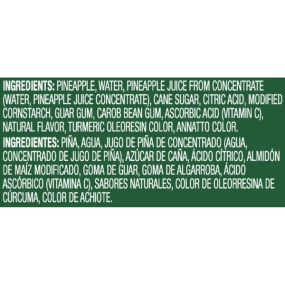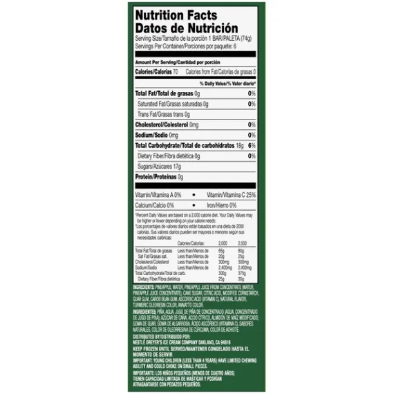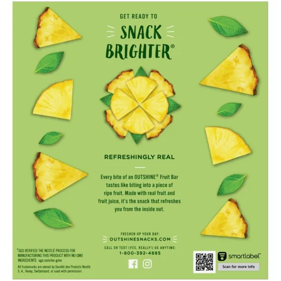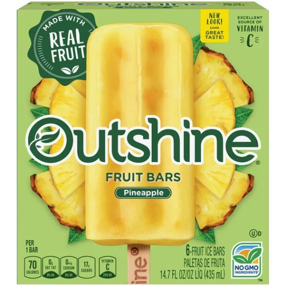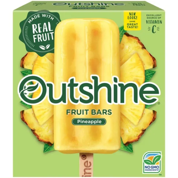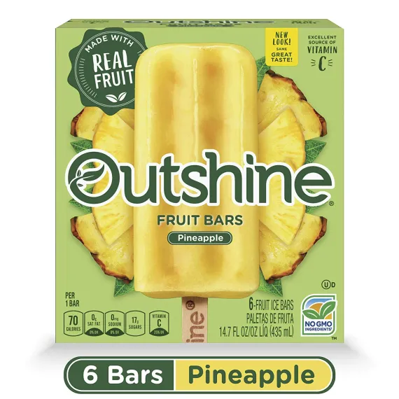Details Ingredients Pineapple, Water, Pineapple Juice from Concentrate (Water, Pineapple Juice Concentrate), Cane Sugar, Citric Acid, Modified Cornstarch, Guar Gum, Carob Bean Gum, Ascorbic Acid (Vitamin C), Natural Flavor, Turmeric Oleoresin Color, Annatto Color. Show more Product features OUTSHINE Pineapple Frozen Fruit Bars are one of the tastiest ways to refresh your day. Our pineapple fruit bars are made with real, honest-to-goodness fruit. They are also completely gluten and fat free, have no GMO ingredients,* do not contain high fructose corn syrup or artificial colors or flavors.** The bars are transported using a chilled shipping method to arrive frozen and ready to enjoy. These feel-good, healthy snacks are the perfect way to snack and shine. *SGS verified the Nestlé process for manufacturing this product with no GMO ingredients sgs.com/no-gmo. **Added colors from natural sources. OUTSHINE Pineapple Frozen Fruit Bars box contains 6 great-tasting frozen bars Made with real fruit, these fruit bars are an excellent source of Vitamin C These frozen fruit bars featuring real pineapple as the first ingredient are so delicious and make a great healthy snack Our frozen fruit bars are gluten free and fat free, have no GMO ingredients,* do not contain high fructose corn syrup or artificial colors or flavors** OUTSHINE is transported using a chilled shipping method to arrive frozen Special Features No Net Quantity of Content 6.0 X 1 Bar (74g)