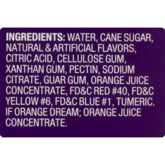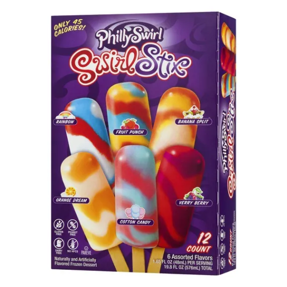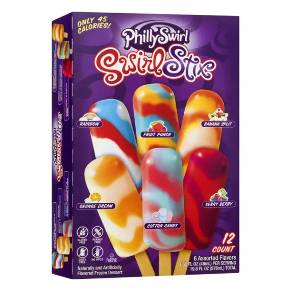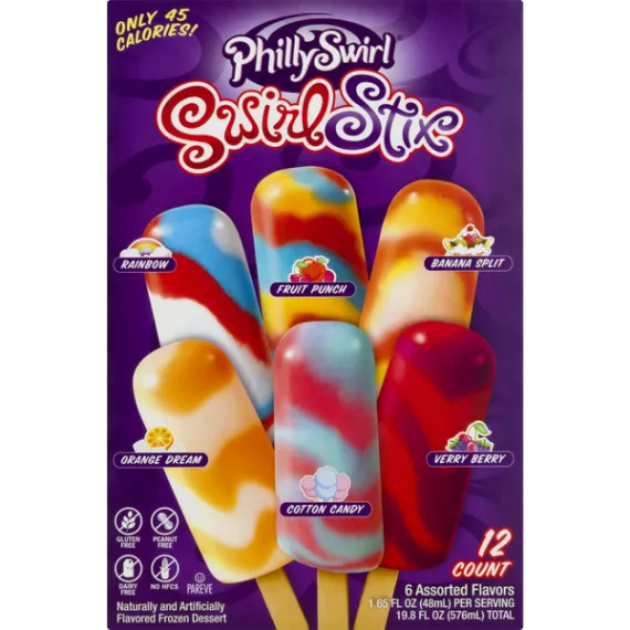 Details Ingredients BANANA SPLIT: [WATER, SUGAR, NATURAL FLAVOR (FD&C RED#40, FD&C BLUE #1), CITRIC ACID, TURMERIC (COLOR), PECTIN, XANTHAN GUM, GUAR GUM, LOCUST BEAN GUM], FRUIT PUNCH: [WATER, SUGAR, NATURAL FLAVOR, CITRIC ACID, TURMERIC (COLOR), FD&C BLUE #1, PECTIN, XANTHAN GUM, GUAR GUM, LOCUST BEAN GUM], RAINBOW AND VERY BERRY: [WATER, SUGAR, NATURAL FLAVOR (FD&C BLUE #1, FD&C RED #40), CITRIC ACID, PECTIN, XANTHAN GUM, GUAR GUM, LOCUST BEAN GUM], ORANGE DREAM: [WATER, SUGAR, ORANGE JUICE FROM CONCENTRATE (WATER, ORANGE JUICE CONCENTRATE), NATURAL FLAVOR (FD&C YELLOW #6), CITRIC ACID, PECTIN, XANTHAN GUM, GUAR GUM, LOCUST BEAN GUM], COTTON CANDY: [WATER, SUGAR, ARTIFICIAL FLAVOR, COLORS (FD&C BLUE #1, FD&C RED #40, FD&C YELLOW #6), PECTIN, XANTHAN GUM, GUAR GUM, LOCUST BEAN GUM]. Show more Product features Frozen Dessert, Assorted, Swirl Stix, Box 12 CT Naturally and artificially flavored frozen dessert. Rainbow. Fruit punch. Banana split. Orange dream. Cotton candy. Verry berry. Only 45 calories! Gluten free. Peanut free. Dairy free. No HFCS. PhilySwirl Pholkfore: Textures inspired by classic Philadelphia Italian ice, with flavors perfected by our top secret swirl machine. Swirl Stix are the fun frozen treat when you crave something sweet! www.PhillySwirl.com. Rainbow: white lemon, cherry & blueberry swirl. Orange Dream: orange & marshmallow swirl. Cotton Candy: a melt-in-your mouth classic carnival flavor. Banana Split: banana, marshmallow & strawberry shortcake swirl. Fruit Punch: fruity flavors swirled into a classic favorite. Verry Berry: blackberry & cherry swirl. This product is peanut free, dairy free and gluten free. Manufactured in a peanut free facility. www.phillyswirl.com. Keep frozen. 12 - 1.65 fl oz (48 ml) sticks [19.8 fl oz (576 ml) total] 877-378-4757 Swirl Stix, Assorted Naturally and artificially flavored frozen dessert. Rainbow. Fruit punch. Banana split. Orange dream. Cotton candy. Verry berry. Only 45 calories! Gluten free., Peanut free., Dairy free., Manufactured in a peanut free facility. No HFCS., Rainbow: White lemon, cherry & blueberry swirl. Orange Dream: Orange & marshmallow swirl. Cotton Candy: A melt-in-your mouth classic carnival flavor. Banana Split: Banana, marshmallow & strawberry shortcake swirl. Fruit Punch: Fruity flavors swirled into a classic favorite. Verry Berry: Blackberry & cherry swirl., PhillySwirl Pholklore: Textures inspired by Classic Philadelphia Italian Ice, with flavors perfected by our top secret swirl machine. Swirl Stix are the fun frozen treat when you crave something sweet! www.phillyswirl.com Special Features Dairy free Net Quantity of Content 12 X 48 g