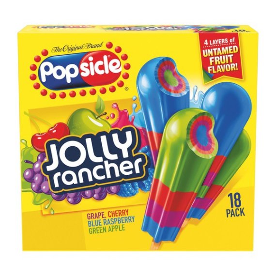 Details Ingredients WATER, HIGH FRUCTOSE CORN SYRUP, CORN SYRUP, SUGAR, CONTAINS 1 PERCENT OR LESS OF EACH OF THE FOLLOWING: MALIC ACID, CITRIC ACID, GUAR GUM, ASCORBIC ACID (VITAMIN C), NATURAL AND ARTIFICIAL FLAVOR, BEET JUICE CONCENTRATE (COLOR), LOCUST BEAN GUM, RED 40, BLUE 1, YELLOW 5 Show more Product features These Jolly Rancher frozen ice pops are loaded with the delicious fruit flavor of the popular Jolly Rancher candy including grape, cherry, green apple and blue raspberry. Each delightful Jolly Rancher ice pop contains 40 calories, 0g saturated fat, 0mg sodium, and 7g sugars. A Jolly Rancher Popsicle is the perfect frozen treat for any occasion – each fruit ice pop containing a mix of different flavors that are sure to keep you coming back for more! Popsicle and Jolly Rancher, two of everyone’s favorite treats – what more can you ask for! These ice popsicles won’t last in your freezer very long so you better stock up! Popsicle ice pops have been a treasured American treat for over 100 years and remains America's favorited ice pop. In 1905 11 year old boy, Frank Epperson invented the first ice pop. One night Frank poured soda powder into water and mixed it with a stirring stick. He accidently left the mixture outside all night in the cold. Frank awoke the next morning to find his drink was frozen like an icicle. It was a hit with his friends and a classic was born! Visit Popsicle.com to check out more than 26 ice pop varieties, get crafting ideas and learn about where to buy! Try these Jolly Rancher ice pops today. Popsicle Ice Pops Jolly Rancher 18 ct Popsicle and Jolly Rancher come together to bring you these deliciously fruity ice pops! 4 great, fruity Jolly Rancher flavors - grape, cherry, green apple, and blue raspberry Each Jolly Rancher pop contains 40 calories, 0g saturated fat, 0mg sodium, and 7g of sugar 18 ice pops per pack, enough for the whole family and more! A Jolly Rancher frozen ice pop is the perfect treat for any occasion Popsicle pops are America's favorite ice pop Special Features With a touch of gelatin Net Quantity of Content 18 X 1 Pop