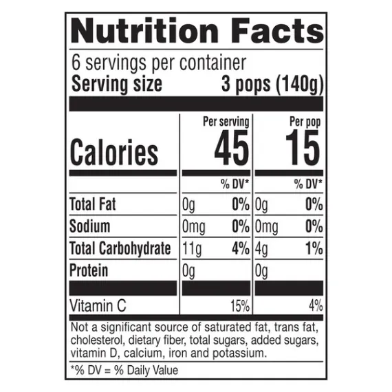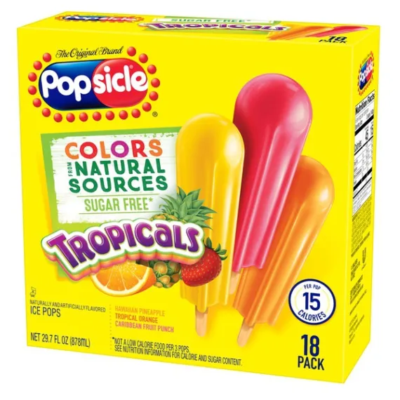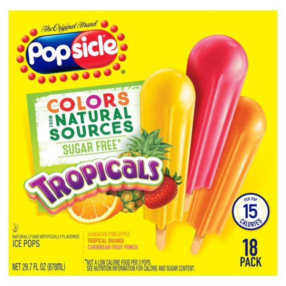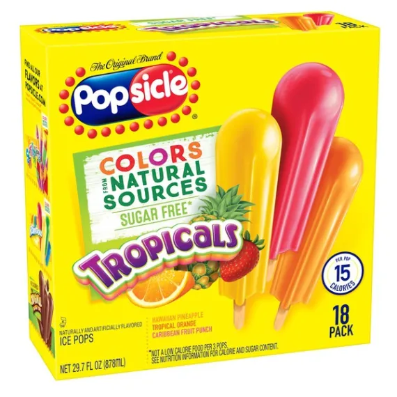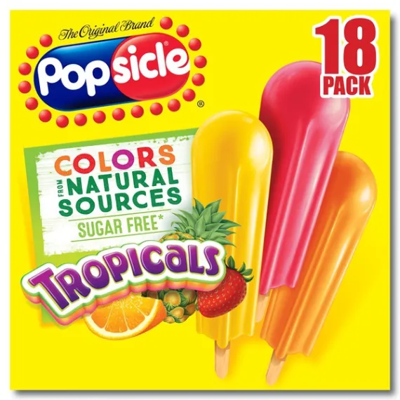 Details Ingredients WATER, GLYCERIN, MALTODEXTRIN (CORN), LESS THAN 2% OF: CITRIC ACID, GUAR GUM, VEGETABLE JUICE (FOR COLOR), ASPARTAME*, ACESULFAME POTASSIUM, NATURAL AND ARTIFICIAL FLAVOR, ASCORBIC ACID (VITAMIN C), TURMERIC OLEORESIN (FOR COLOR), ANNATTO EXTRACT (COLOR), LOCUST BEAN GUM. *PHENYLKETONURICS: CONTAINS PHENYLALANINE Show more Product features Enjoy Tropical Paradise from inside your home with Popsicle Sugar Free Tropicals ice pops. These delicious fruit ice pops come in 3 refreshing and sugar free flavors: Hawaiian Pineapple, Tropical Orange, Caribbean Fruit Punch. Taste the ultimate summer refreshment in these tropical fruit pops, with each sugar free Popsicle pop containing 15 calories, 0g saturated fat, 0mg sodium, 0g sugars. Which flavor of frozen ice pop is your favorite? The pineapple Popsicle? Orange Popsicle? Fruit Punch Popsicle? Whatever it is, there is a refreshing fruit flavor for everyone! Popsicle pops have been a treasured American treat for over 100 years and remains America’s favorite ice popsicle. In 1905, 11 year old boy, Frank Epperson invented the first ice pop. One night Frank poured soda powder into water and mixed it with a stirring stick. He accidently left the mixture outside all night in the cold. Frank awoke the next morning to find his drink was frozen like an icicle. It was a hit with his friends and a classic was born! Visit Popsicle.com to check out all of our ice pop varieties, learn about new products, and sign up to receive email news! Be sure to try our other products in the Popsicle family! Popsicle Ice Pops Sugar Free Tropicals 18ct Enjoy tropical paradise from anywhere with Popsicle Sugar Free Tropicals Ice Pops Three fruity, tropical flavors to chose from: Hawaiian Pineapple, Tropical Orange, Caribbean Fruit Punch Taste the ultimate summer refreshment with these fruity, refreshing tropical ice pops Each box contains 18 sugar free ice pops, enough for the whole family and more! Each ice pop contains 15 calories, 0g saturated fat, 0mg sodium and 0g of sugar Popsicle pops are America's favorite ice pop Net Quantity of Content 6 X 150 g