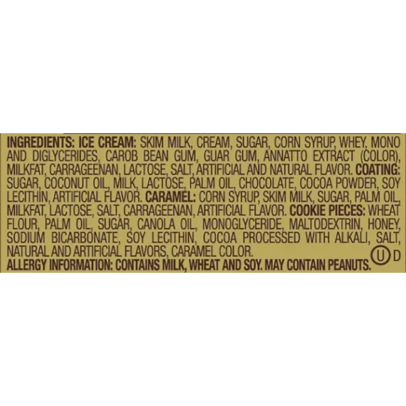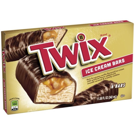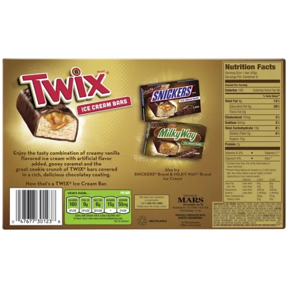 Details Ingredients ICE CREAM: SKIM MILK, CREAM, SUGAR, CORN SYRUP, WHEY, MONO AND DIGLYCERIDES, CAROB BEAN GUM, GUAR GUM, ANNATTO EXTRACT (COLOR), MILKFAT, CARRAGEENAN, LACTOSE, SALT, NATURAL AND ARTIFICIAL FLAVOR. COATING: SUGAR, COCONUT OIL, MILK, LACTOSE, PALM OIL, CHOCOLATE, COCOA POWDER, SOY LECITHIN, ARTIFICIAL FLAVOR. CARAMEL: CORN SYRUP, SKIM MILK, SUGAR, PALM OIL, MILKFAT, LACTOSE, SALT, CARRAGEENAN, ARTIFICIAL FLAVOR. COOKIE PIECES: WHEAT FLOUR, PALM OIL, SUGAR, CANOLA OIL, MONOGLYCERIDE, MALTODEXTRIN, HONEY, SODIUM BICARBONATE, SOY LECITHIN, COCOA PROCESSED WITH ALKALI, SALT, NATURAL AND ARTIFICIAL FLAVORS, CARAMEL COLOR. Show more Product features Everyone's favorite cookie bar is ready to chill. TWIX Ice Cream Bars are made with rich, creamy vanilla ice cream layered with smooth caramel and crunchy cookie to give you just the right combination of chocolate, ice cream and crunchy deliciousness. These individually wrapped TWIX Candy Bar Ice Cream Novelties are great for birthday parties, summer picnics and sharing with friends. There's no wrong way to enjoy the iconic taste of TWIX Candy Ice Cream Bars. Also try SNICKERS, MILKY WAY and M&M's Ice Cream Bars to get a taste of all of your favorite chocolate brands in ice cream. Contains one 6-count box of TWIX Ice Cream Bars With Vanilla Ice Cream Made with vanilla ice cream, caramel, and cookie pieces These ice cream bars are covered in a milk chocolate shell Share everyone's favorite cookie bar in a delicious frozen treat Stock your freezer with TWIX Candy Ice Cream Novelties Special Features No Net Quantity of Content 6.0 X 1 bar (45g)