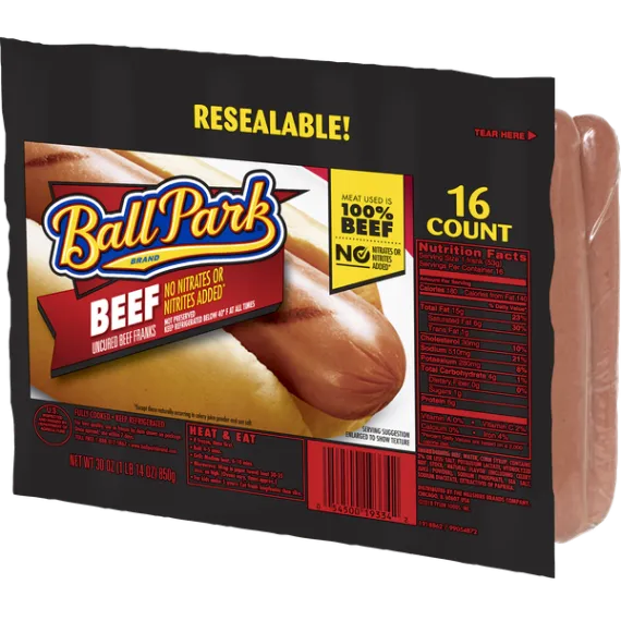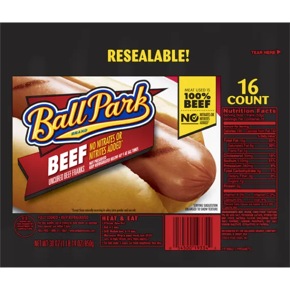 Details Ingredients BEEF, WATER, CORN SYRUP, CONTAINS 2% OR LESS: SALT, POTASSIUM LACTATE, HYDROLYZED BEEF STOCK, SODIUM PHOSPHATE, CELERY JUICE POWDER, NATURAL FLAVOR, SEA SALT, SODIUM DIACETATE, EXTRACTIVES OF PAPRIKA. Show more Product features Taste how 100% Beef turns a great hot dog into a grill-worthy masterpiece. Ball Park® Original Length Beef Hot Dogs are made with 100% beef and no added nitrites or nitrates*, no by-products or fillers, and no artificial flavors or color. Each pack includes 16 hot dogs. Ball Park® Brand was born on a warm summer's day at Detroit Tiger's Stadium in 1957. Maybe that's why Ball Park® Brand and summer go hand-in-hand. Over 60 years later, they're not just burgers and hot dogs, they're a summer tradition. Whether it's the roar of the stadium, the sizzle of the grill, or the smell of the backyard cookout, there's something about Ball Park® Brand that just tastes likes summer, no matter what the season. So fire up the grill, invite over family and friends, and Bring On Summer™ with Ball Park® Brand. *Except those naturally occurring in sea salt and celery juice powder One pack of 16 Original Length Beef Hot DogsMade with 100% BeefNo added nitrites or nitrates, except for those naturally occurring in sea salt and celery juice powderNo by-products or fillersNo artificial colors or flavorsPerfect for cookouts and barbecuesBring On Summer™ with Ball Park® Brand Net Quantity of Content 16 X 53 g