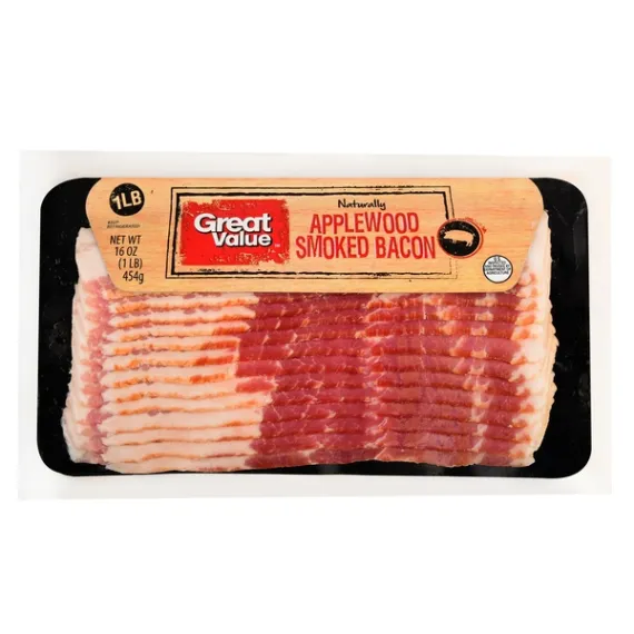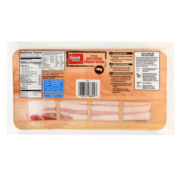 Details Ingredients Pork Cured with: Water, Salt, Sugar, Sodium Phosphates, Sodium Erythorbate, Sodium Nitrite. Product features Great Value Applewood Smoked Bacon is all natural bacon cured with a perfect balance of salt and sugar and smoked over Applewood chips. This natural fresh pork bacon has a distinct robust flavor. Whether you like your bacon extra crispy or a bit soft, this all natural Applewood Smoked Bacon is sure to satisfy your taste buds. It makes a great addition to the breakfast table. Serve with a side of eggs and fruit for a wholesome breakfast. You can also add this bacon to juicy burgers, tasty sandwiches or your other favorite homemade meals. Add some flavor to your day with Great Value Applewood Smoked Bacon.Great Value products provide families with affordable, high-quality grocery and household consumable options. With our wide range of product categories spanning grocery and household consumables, we offer you a variety of products for your family's needs. Our products are conveniently available online and in Walmart stores nationwide, allowing you to stock up and save money at the same time. Great Value Bacon, Applewood Smoked, 16 oz:USDA InspectedApplewood smokedGreat addition to the breakfast tablePerfect for burgers, sandwiches and other recipes Net Quantity of Content ABOUT 8 X 17 g