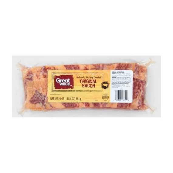 Details Ingredients PORK CURED WITH: WATER, SALT, SUGAR, SODIUM PHOSPHATE, SODIUM ERYTHORBATE, SODIUM NITRITE. Product features Great Value Bacon is naturally smoked with an irresistible hickory flavor. This thick sliced bacon is the perfect addition to your morning meals or as an ingredient in your favorite dishes. Serve with sunny side up eggs, fresh fruit and toast for a filling breakfast. Use it to make tasty homemade BLTs. Chop it up and add to mashed potatoes and gravy, green beans or black eye peas. This bacon also offer a nutritional benefit as it is a good source of protein. This pack comes with 24 oz so you can stock up on your favorite hickory smoked bacon.Great Value products provide families with affordable, high quality grocery and household consumable options. With our wide range of product categories spanning grocery and household consumables, we offer you a variety of products for your family's needs. Our products are conveniently available online and in Walmart stores nationwide, allowing you to stock up and save money at the same time. Great Value Natural Hickory Smoked Bacon, 24 ozThick slicedHickory smoked flavorGreat for BLTsNet weight 24 oz Special Features U.S. inspected And passed by department Of agriculture Net Quantity of Content 12 X 17 g