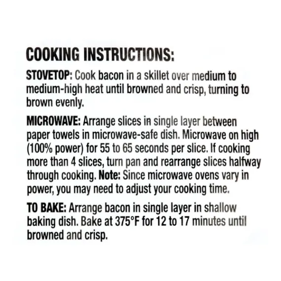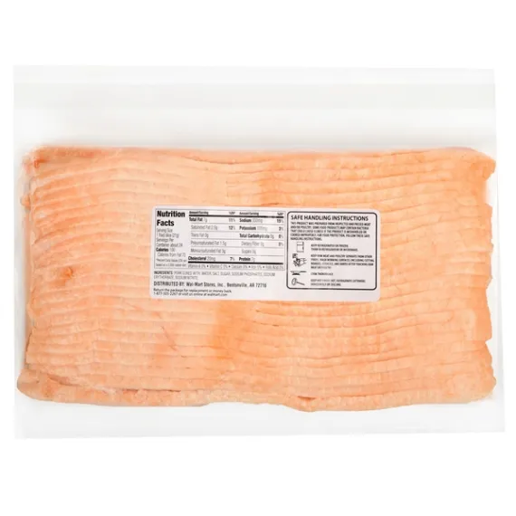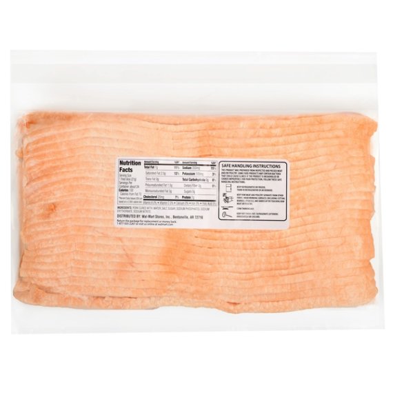 Details Ingredients PORK (CURED WITH WATER, SALT, SUGAR, SODIUM PHOSPHATE, SODIUM ERYTHORBATE, SODIUM NITRITE). Product features Great Value Original Bacon is all natural bacon cured with a perfect balance of salt and sugar and is naturally hickory smoked. This natural fresh pork bacon has a distinct robust flavor. Whether you like your bacon extra crispy or a bit soft, this all natural Original Bacon is sure to satisfy your taste buds. It makes a great addition to the breakfast table. Serve with a side of eggs and fruit for a wholesome breakfast. You can also add this bacon to juicy burgers, tasty sandwiches or your other favorite homemade meals. Add some flavor to your day with Great Value Original Bacon.Great Value products provide families with affordable, high-quality grocery and household consumable options. With our wide range of product categories spanning grocery and household consumables, we offer you a variety of products for your family's needs. Our products are conveniently available online and in Walmart stores nationwide, allowing you to stock up and save money at the same time. Great Value Bacon, Applewood Smoked, 24 oz:USDA InspectedNaturally Hickory SmokedGreat addition to the breakfast tablePerfect for burgers, sandwiches and other recipes Net Quantity of Content ABOUT 28 X 15 g