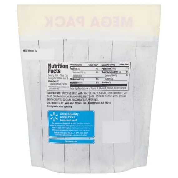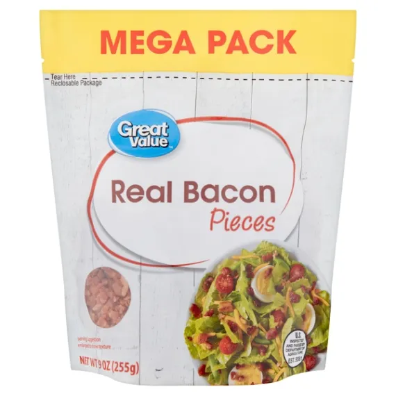 Details Ingredients BACON (CURED WITH WATER, SALT, SUGAR, SODIUM NITRITE. MAY ALSO CONTAIN SMOKE FLAVORING, DEXTROSE, BROWN SUGAR, SODIUM PHOSPHATES, SODIUM ERYTHORBATE, SODIUM ASCORBATE, POTASSIUM CHLORIDE, FLAVORING). Show more Product features Take your culinary creations to the next level with our yummy, chewy Great Value Real Bacon Pieces Mega Pack. Other products labeled “bacon bits” may contain little or no meat, or include food additives that can be harmful to your health. Our real bacon pieces are packed with 100% real bacon with 3g of protein in every tablespoon. Top off a Caesar salad, add a salty crunch to a loaded baked potato with sour cream, shredded cheddar cheese, and chives, or simply enjoy by the handful straight from the bag. Great Value Real Bacon Pieces are also an excellent snacking option when you're on the go and need a little extra protein boost to power through your day. They're a kitchen staple every home chef should have on hand. Add some flavor to your next meal with our Great Value Real Bacon Pieces Mega Pack. Great Value products provide families with affordable, high quality grocery and household consumable options. With our wide range of product categories spanning grocery and household consumables, we offer you a variety of products for your family's needs. Our products are conveniently available online and in Walmart stores nationwide, allowing you to stock up and save money at the same time. Real bacon pieces Gluten-free Inspected and passed by the United States Department of Agriculture Refrigerate after opening 9oz mega pack Net Quantity of Content ABOUT 36 X 1 Tbsp