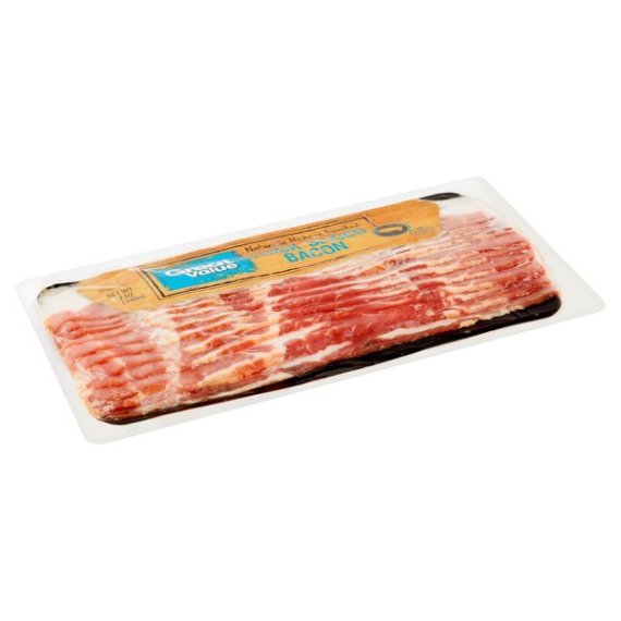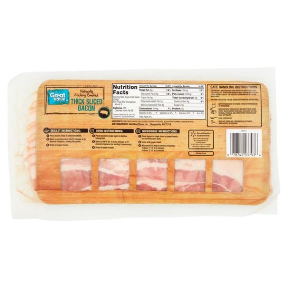 Details Ingredients Pork Cured with: Water, Salt, Sugar, Sodium Phosphates, Sodium Erythorbate, Sodium Nitrite. Product features Great Value Thick Sliced Naturally Hickory Smoked Bacon is made with thickly cut slices that give it a special texture and taste. These thick cuts of natural pork are cured with a perfect balance of salt and sugar and slow smoked with hickory that gives it a distinct robust flavor that has been loved for generations. It is gluten-free too making it a great option for individuals who are sensitive to gluten. Whether you like your bacon extra crispy or a bit soft, these premium, all natural Thick Sliced Naturally Hickory Smoked Bacon will have you covered. Enjoy the sweet, hickory smoked taste on its own or added to your favorite dish.Great Value products provide families with affordable, high quality grocery and household consumable options. With our wide range of product categories spanning grocery and household consumables, we offer you a variety of products for your family's needs. Our products are conveniently available online and in Walmart stores nationwide, allowing you to stock up and save money at the same time. Great Value Thick Sliced Bacon, Hickory Smoked:Natural thick cut pork baconHickory smokedUSDA Inspected and PassedNet weight 12 oz Net Quantity of Content ABOUT 7 X 17 g