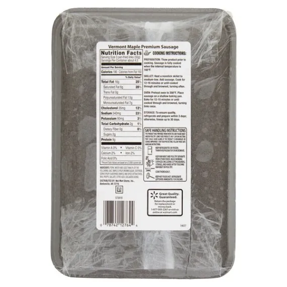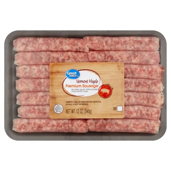 Details Ingredients PORK, SEASONING (SALT, CORN SYRUP SOLIDS, DEXTROSE, MONOSODIUM GLUTAMATE, FLAVORINGS, BHA, PROPYL GALLATE, AND CITRIC ACID), WATER AND MAPLE SYRUP IN BEEF COLLAGEN CASING. Show more Product features Vermont Maple Premium Sausage Great Value Maple Sausage Links Net Quantity of Content ABOUT 4.5 X 57 g