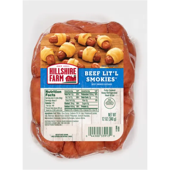 Details Ingredients BEEF, WATER, CORN SYRUP, CONTAINS 2% OR LESS: SALT, POTASSIUM LACTATE, DEXTROSE, NATURAL FLAVOR, SODIUM PHOSPHATE, MONOSODIUM GLUTAMATE, SODIUM DIACETATE, SODIUM ERYTHORBATE, SODIUM NITRITE. Show more Product features Whether you’re crafting an appetizer for a party or looking for a savory bite to eat, Hillshire Farm® Lit’l Smokies® Smoked Sausages are the perfect snack. Made with farmhouse quality cuts of beef and smoked to perfection, these delicious sausages are fully cooked, ready in minutes and bursting with flavor. Hard work. Dedication. Integrity. These are the values we live by—and the ingredients we put into every package of Hillshire Farm® Smoked Sausages. Since 1934, the Hillshire Farm® Brand has stood for the honest, handcrafted meats your family loves, made with the ingredients they deserve. And we’re confident you’ll taste our commitment to quality in every bite. One 12 oz. package of Hillshire Farm® Beef Lit’l Smokies® Smoked SausageMade with quality cuts of meat and smoked to perfectionFully cooked and ready in minutesPerfect for parties and snackingFun, crowd-pleasing snack the whole family will enjoySimply prepare using stove top, microwave or oven Net Quantity of Content ABOUT 7 X 50 g