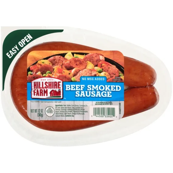 Details Ingredients BEEF, WATER, CORN SYRUP, CONTAINS 2% OR LESS: SPICE AND FLAVOR, SALT, ISOLATED SOY PRODUCT, DEXTROSE, POTASSIUM CHLORIDE, BROWN SUGAR, ISOLATED SOY PROTEIN, POTASSIUM PHOSPHATES, YEAST EXTRACT, BEEF STOCK, SODIUM ERYTHORBATE, SODIUM NITRITE. Show more Product features Handcrafted with natural spices and only the finest cuts of meat, Hillshire Farm® Smoked Sausage is the delicious answer to weeknight dinners. Fully cooked and ready in minutes, our flavorful smoked sausage delivers a farmhouse-quality meal with rich, bold flavor. From soups to stews, it’s an instant family favorite. Hard work. Dedication. Integrity. These are the values we live by—and the ingredients we put into every package of Hillshire Farm® Smoked Sausage. Since 1934, the Hillshire Farm® Brand has stood for the honest, handcrafted meats your family loves, made with the ingredients they deserve. And we’re confident you’ll taste our commitment to quality in every bite. One 12 oz. Hillshire Farm® Beef Smoked Sausage RopePerfectly seasoned and smoked to perfectionMade with quality cuts of meatGreat for meals the whole family can enjoyFully cooked and ready in minutesSimply heat on the stovetop or grill Net Quantity of Content 6 X 2 oz