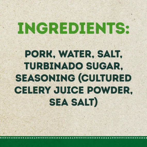 Details Ingredients PORK, WATER, SALT, TURBINADO SUGAR, SEASONING (CULTURED CELERY JUICE POWDER, SEA SALT). Product features Experience The Uncompromising Flavor Of Natural Choice Uncured Bacon. Our Juicy Pork Is Raised Without Any Added Hormones. Yup, That’S Right—Zero. You Can Feel Good About Stacking Those Thick And Meaty Slices High For A Tasty Treat That Satisfies. Make The Natural Choice. Natural Choice Is A Trademark Of Jennie-O Turkey Store, Llc. Made with minimally processed, all natural porkPork raised without added hormones; federal regulations prohibit the use of hormones in pork6 grams of protein and 100 calories per cooked servingNo added nitrates or nitrites except for those naturally occurring in celery and cherry powderGluten free; no artificial ingredients Net Quantity of Content ABOUT 6 X 20 g