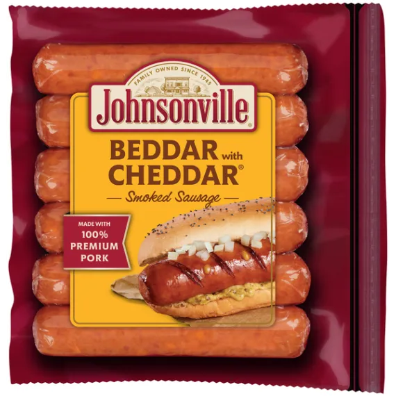 Details Ingredients PORK, WATER, PASTEURIZED PROCESS CHEDDAR CHEESE ([CHEDDAR CHEESE (PASTEURIZED MILK, CHEESE CULTURE, SALT, ENZYMES), WATER, MILKFAT, SODIUM PHOSPHATE, SALT, FRUIT AND VEGETABLE JUICE COLOR, PAPRIKA EXTRACT COLOR, SORBIC ACID], POWDERED CELLULOSE), AND LESS THAN 2% OF THE FOLLOWING: SALT, CORN SYRUP, POTASSIUM LACTATE, SUGAR, NATURAL FLAVORS, SODIUM DIACETATE, SODIUM ERYTHORBATE, SODIUM NITRITE, COLLAGEN CASING. Show more Product features Johnsonville Beddar with Cheddar Smoked Sausage has chunks of Cheddar Cheese in a savory recipe that's become a family favorite! Johnsonville Beddar with Cheddar is made with pasteurized processed cheddar cheese and a collagen casing. There are about six links per 14 oz. package. Each link is approximately 5.25 inches in length. The product is fully cooked, smoked, vacuum packaged and requires refrigeration. Special Features Naturally smoked Net Quantity of Content 6 X 66 g