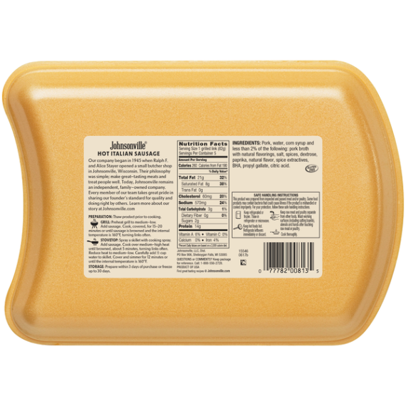 Details       Ingredients  PORK, WATER, CORN SYRUP AND LESS THAN 2% OF THE FOLLOWING: PORK BROTH WITH NATURAL FLAVORINGS, SALT, SPICES, DEXTROSE, PAPRIKA, MONOSODIUM GLUTAMATE, FLAVORINGS, BHA, PROPYL GALLATE, CITRIC ACID.      Show more      Product features   Enjoy authentic Italian flavor with Johnsonville Hot Italian Sausages! Made with only premium cuts of pork with natural casings and perfectly blended with fresh herbs and spices, our mild sausages never contain any artificial colors or flavors. Great for delicious Italian-inspired dinners, cookouts, and a variety of recipes, Johnsonville Mild Italian Sausages are easy to cook and sure to please the whole family.    Family-owned since 1945, Johnsonville began when Ralph F. and Alice Stayer opened a small butcher shop in Johnsonville, Wisconsin. Their philosophy was simple; take premium cuts of meat with quality spices to make great-tasting sausages. Today, Johnsonville is made with the same philosophy: Big Taste from a Small Town.        Enjoy authentic Italian flavor with Johnsonville Hot Italian Sausages! Made with only premium cuts of pork with natural casings and perfectly blended with fresh herbs and spices, our mild sausages never contain any artificial colors or flavors. Great for delicious Italian-inspired dinners, cookouts, and a variety of recipes, Johnsonville Hot Italian Sausages are easy to cook and sure to please the whole family.    Family-owned since 1945, Johnsonville began when Ralph F. and Alice Stayer opened a small butcher shop in Johnsonville, Wisconsin. Their philosophy was simple; take premium cuts of meat with quality spices to make great-tasting sausages. Today, Johnsonville is made with the same philosophy: Big Taste from a Small Town.          Special Features  Us inspected by dept of agriculture    Net Quantity of Content   5 X 82 g