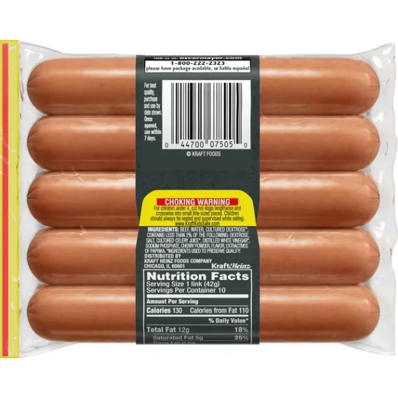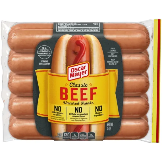 Details Ingredients Beef, Water, Cultured Dextrose*, Contains Less Than 2% Of Dextrose, Salt, Cultured Celery Juice*, Distilled White Vinegar*, Sodium Phosphate, Cherry Powder, Flavor, Extractives Of Paprika. *Ingredients Used To Preserve Quality. Show more Product features Oscar Mayer Classic Uncured Beef Franks deliver the signature beef frank flavor in a ready-to-heat pre-cooked format. Made with no added nitrates or nitrites except for those naturally occurring in celery juice, these uncured hot dogs feature beef that's been inspected and passed by the US Department of Agriculture. They also are free of artificial preservatives, flavors and colors, so you can enjoy the quality uncured franks. Toss a link on the barbecue grill, heat it on the stove, or toast it over a campfire for a savory snack or part of a filling meal. These hot dogs come in a resealable 15 ounce plastic package to keep them fresh in the refrigerator. One 15 oz. package of Oscar Mayer Classic Uncured Beef Franks Oscar Mayer Classic Beef Franks are made with USDA certified beef Made from beef with no fillers or by-products for great taste and quality Beef franks with no added nitrates or nitrites except for those naturally occurring in celery juice Uncured for a classic beef taste Fully cooked for easy preparation Resealable plastic packaging keeps the beef hot dogs fresher for longer Special Features Fully Cooked Net Quantity of Content 10.0 X 1 link (42g)