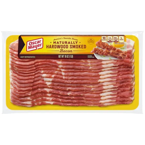 Details Ingredients Cured With Water, Salt, Sugar, Sodium Phosphates, Sodium Ascorbate, Sodium Nitrite. Product features Oscar Mayer Naturally Hardwood Smoked Bacon delivers smoky bacon flavor in consistent slice sizes that cook up crisp in minutes. Naturally smoked with real Wisconsin hardwoods for a premium and delicious flavor, this fresh bacon is made from carefully selected, hand-trimmed cuts of pork raised without hormones. Use this naturally smoked bacon as part of a hearty breakfast of bacon and eggs, or to top your favorite dishes like salads or baked potatoes. This package of bacon comes in a 16 ounce package size so you can feed your entire family with the fresh, smokey flavor of America's Favorite Bacon. One 16 oz. package of Oscar Mayer Naturally Hardwood Smoked Bacon Oscar Mayer Naturally Hardwood Smoked Bacon is bacon with a smoky flavor Naturally smoked with real Wisconsin hardwoods for a classic bacon flavor Hand-trimmed cuts from pork raised without hormones Use this bacon for cooking and adding to recipes Package of consistently cut bacon slices Sealed plastic packaging to preserve freshness Special Features America's favorite Net Quantity of Content 9.0 X 2 skillet cooked slices (19g)