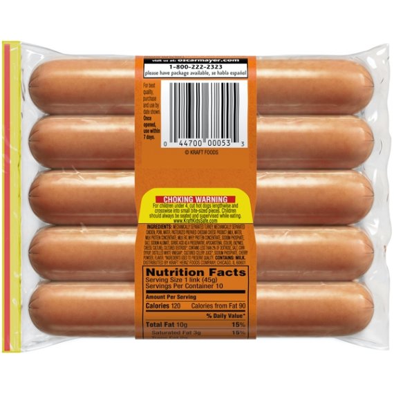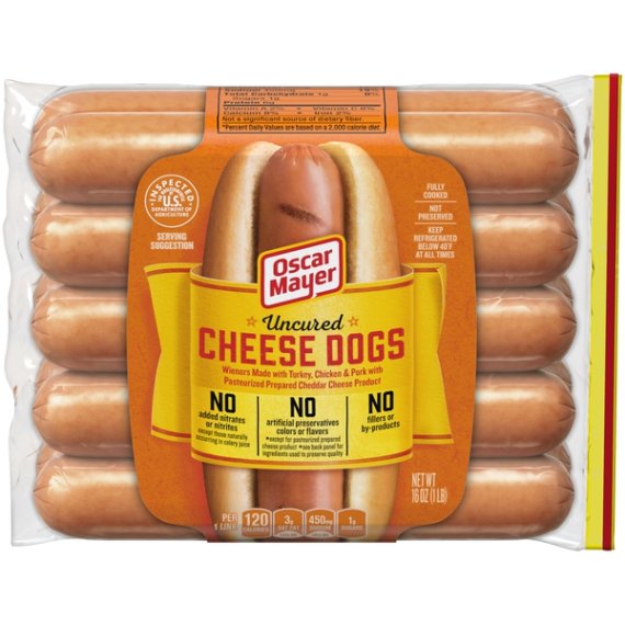 Details Ingredients Mechanically Separated Turkey, Mechanically Separated Chicken, Pork, Water, Pasteurized Prepared Cheddar Cheese Product (Milk, Water, Milk Protein Concentrate, Milk Fat, Whey Protein Concentrate, Sodium Phosphate, Salt, Sodium Alginate, Sorbic Acid As A Preservative, Apocarotenal [Color], Enzymes, Cheese Culture), Cultured Dextrose*, Contains Less Than 2% Of Dextrose, Salt, Corn Syrup, Distilled White Vinegar*, Cultured Celery Juice*, Sodium Phosphate, Cherry Powder, Flavor. *Ingredients Used To Preserve Quality. Contains: Milk. Show more Product features Oscar Mayer Uncured Cheese Dogs are made with the tasty wieners you love plus tons of cheesy goodness that is sure to please the whole family. Made with no artificial preservatives, except for pasteurized prepared cheese product, see back panel for ingredients used to preserve quality, and no added nitrates or nitrites, except for those naturally occurring in celery juice, these uncured hot dogs are a camping dinner delight. Serve Oscar Mayer Uncured Cheese Dogs with sweet relish or chili sauce for a spicy kick, or crisp these fully cooked dogs on the barbecue grill for added smoky flavor. Vacuum sealed in a 16 ounce recloseable pouch, these wieners have cheese mixed in that makes hot dog night a big hit at your family dinner. One 16 oz. pack of Oscar Mayer Uncured Cheese Hot Dogs Oscar Mayer Uncured Cheese Dogs are made with turkey, chicken and pork Uncured wieners have no added nitrates or nitrites, except those occurring naturally in celery juice Contains no by-products Hot dogs with added cheese the whole family will enjoy Fully cooked wieners cut down on prep time Serve with sweet relish or chili sauce Special Features Fully Cooked Net Quantity of Content 10.0 X 1 Link (45g)